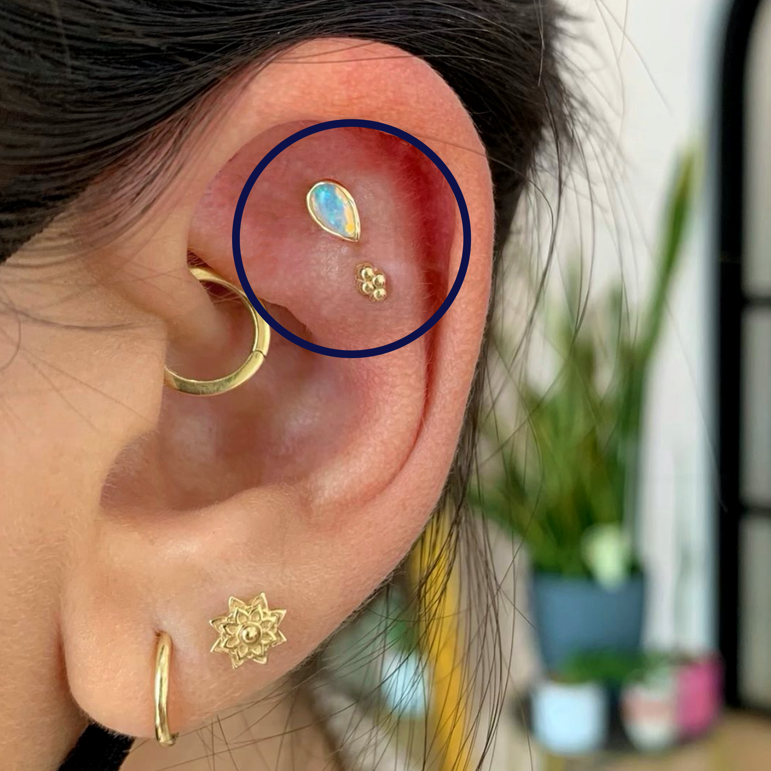 A flat or faux rook piercing is done in along the area of the upper ear above the conch, closer in to the center of the ear than a helix piercing.