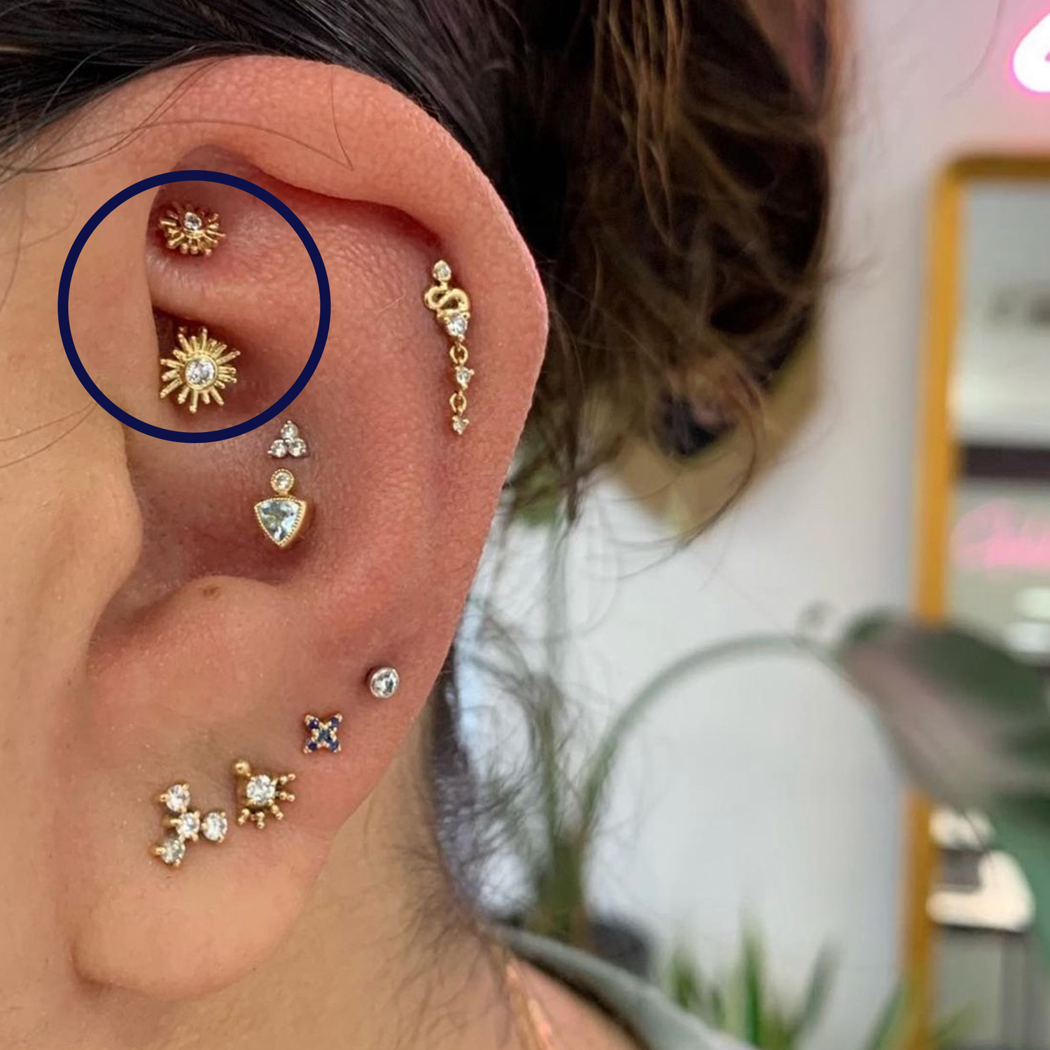 A rook piercing is a type of ear piercing that goes through the anti-helix, a fold of cartilage located above the tragus and slightly below the innermost ridge of the ear (the helix).