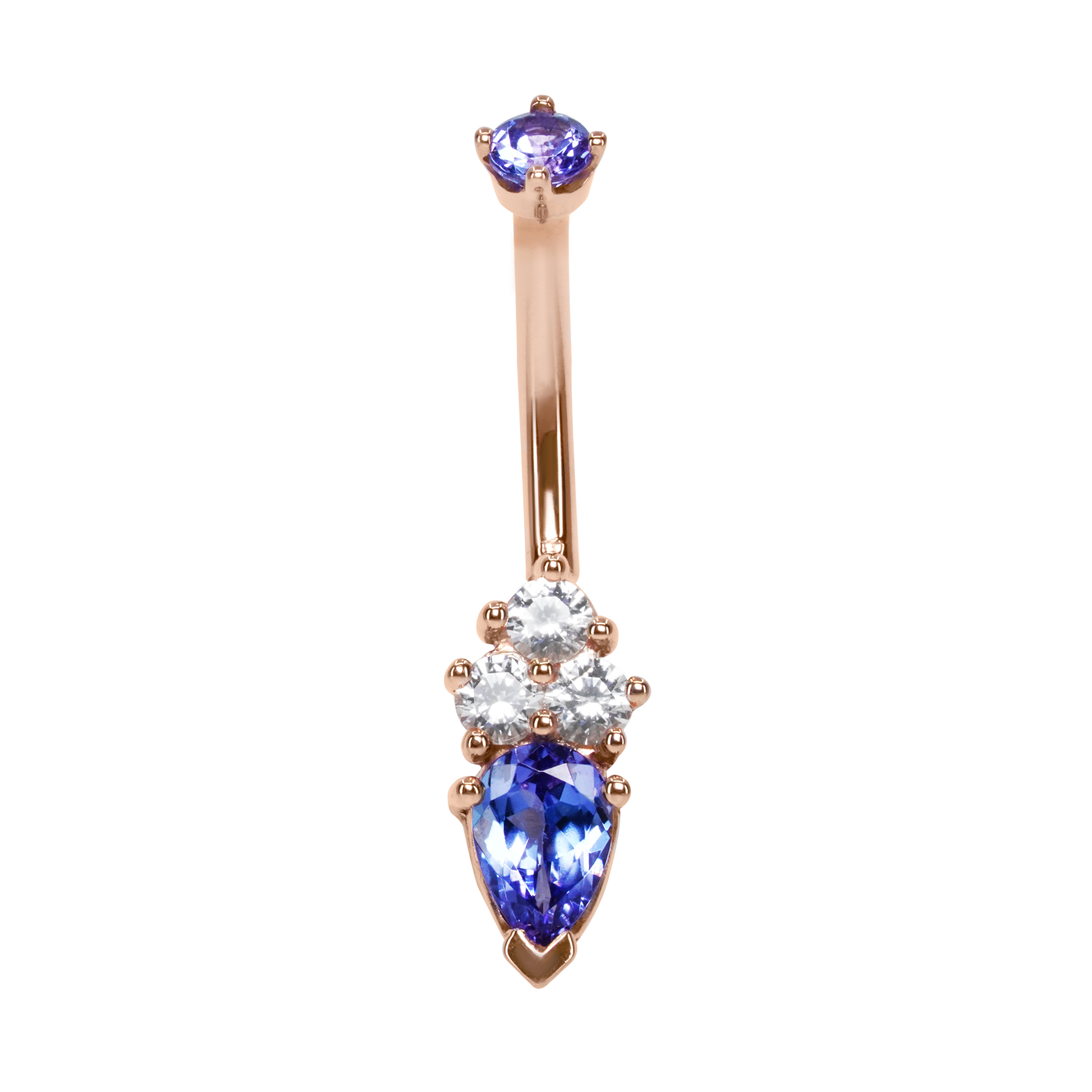 The Little Tracy barbell is nothing short of a showstopper. A single prong-set tanzanite sits at the top of the barbells, with a tanzanite pear and a large white sapphire tri-prong cluster. Perfect for navel piercings.