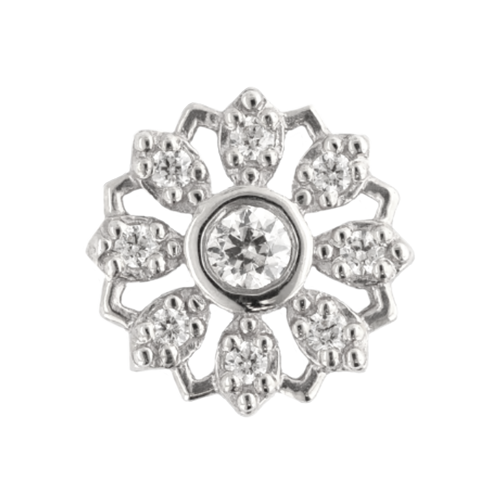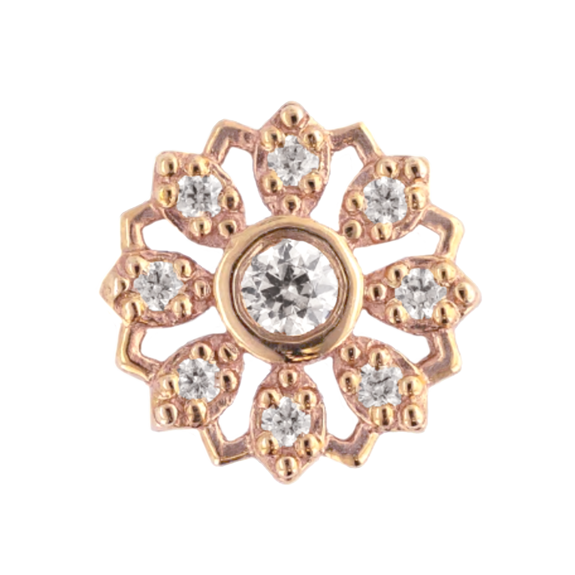 The Rosette is a gorgeous low-profile flower end complete with a 2mm diamond center and filigree petals. At a 14 gauge thread pattern, it's perfect for conch, flat, helix and philtrum piercings.