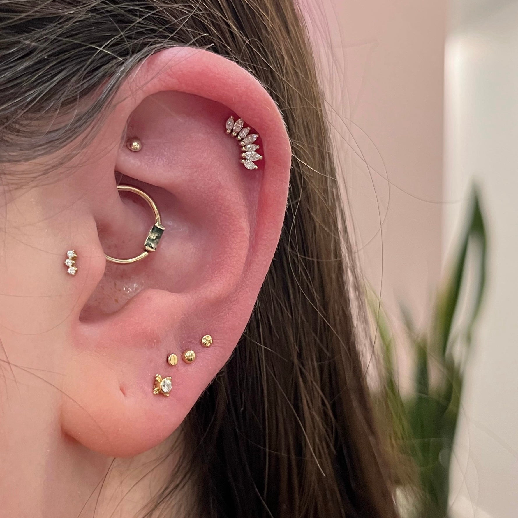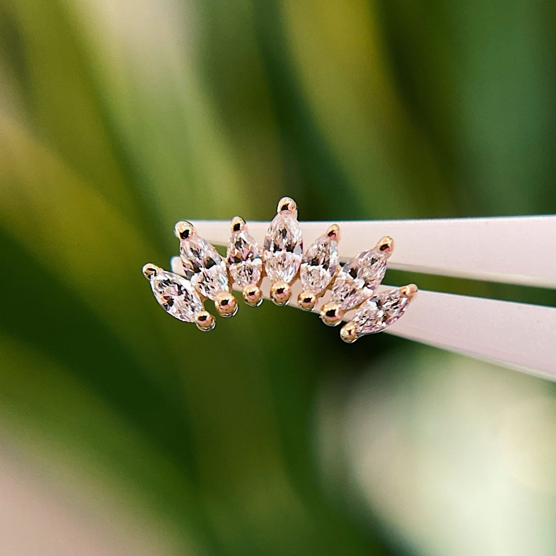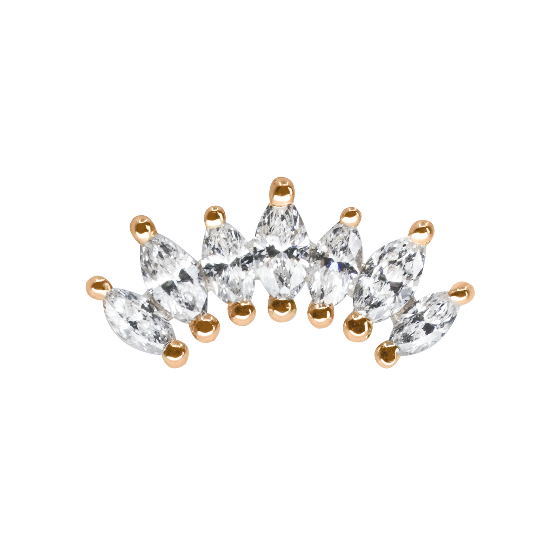 This miniature version of the classic Athena has seven alternating 3mm x 1.5mm and 2.5mm x1.25mm bright marquise diamonds in a fanned row. This piece is the perfect statement piece in a helix, conch, or flat piercing!