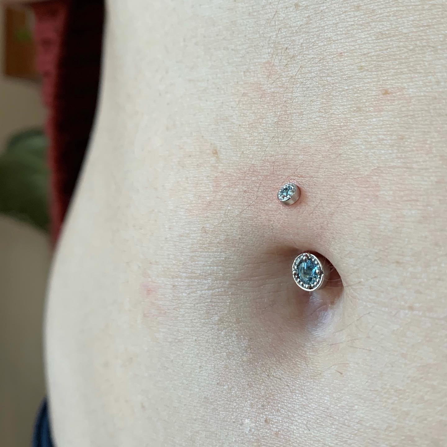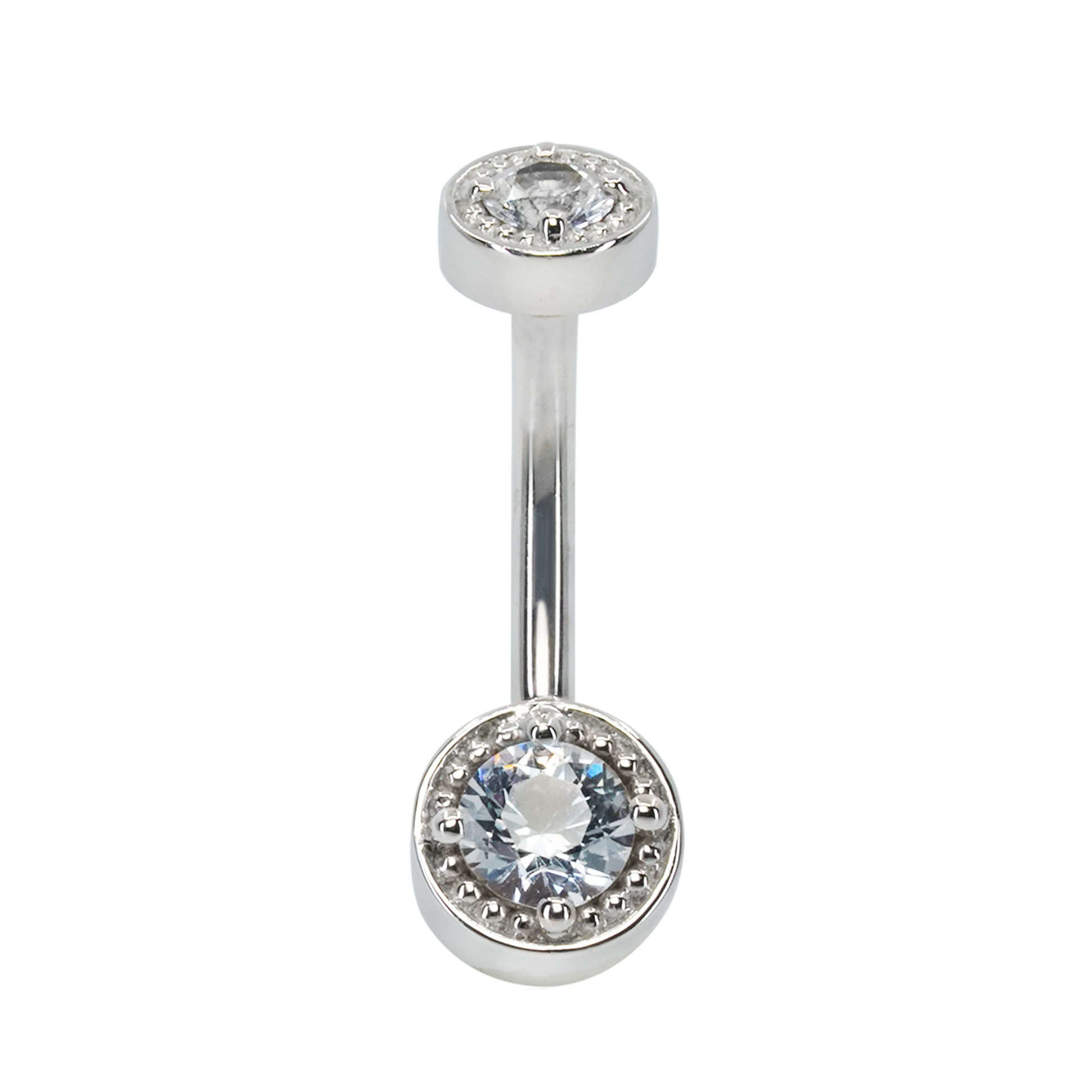 The Rachel barbell is a twist on a classic with double milgrain bezel set gems. The top portion holds a 2mm white sapphire and the bottom holds a 4mm white sapphire, with the overall size listed below in our sizing section. Perfect for a classic navel piercing.