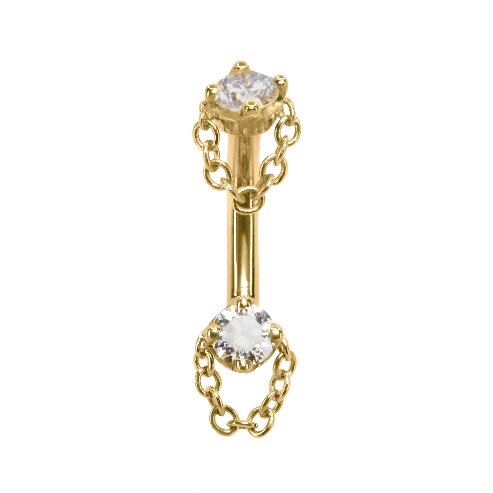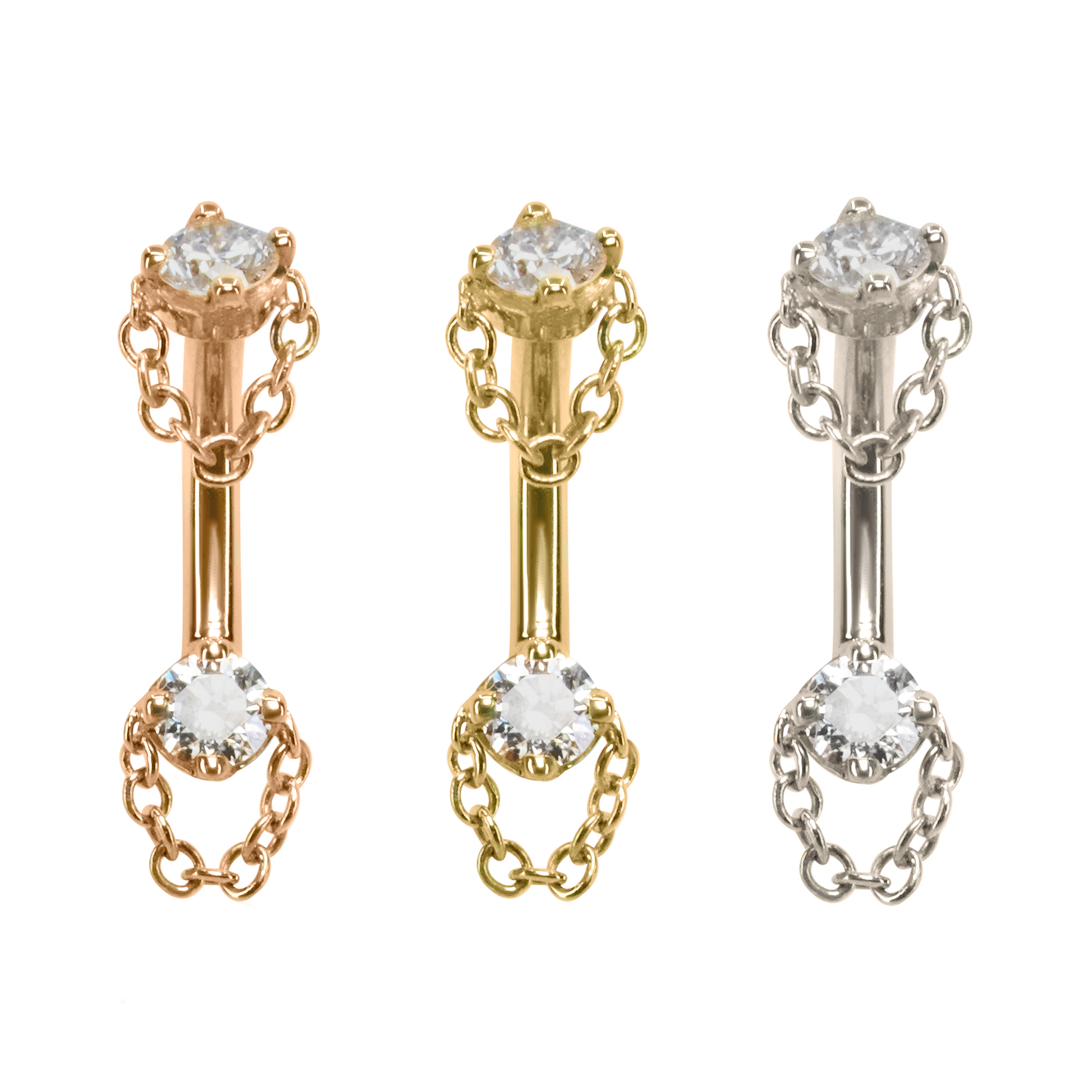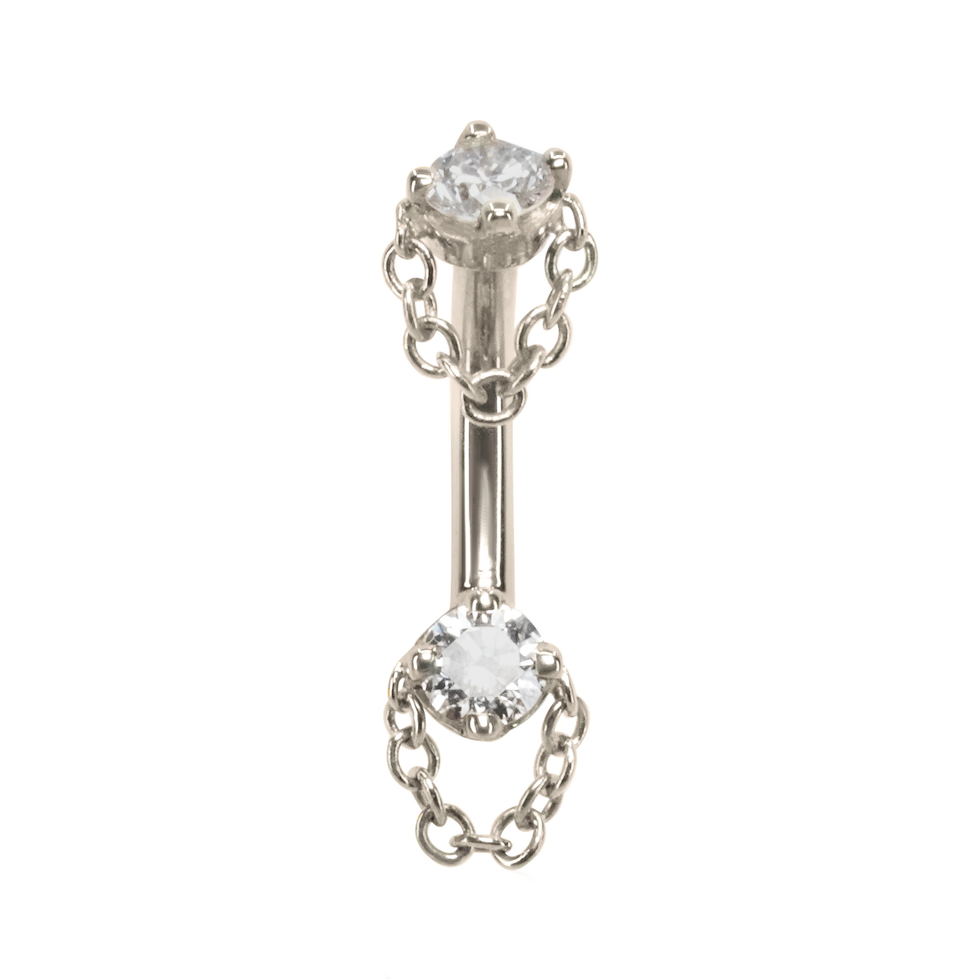 The Rianna curve features two bright white diamonds, both with their own decorative chain garland. Perfect for rook or healed navel piercings.
