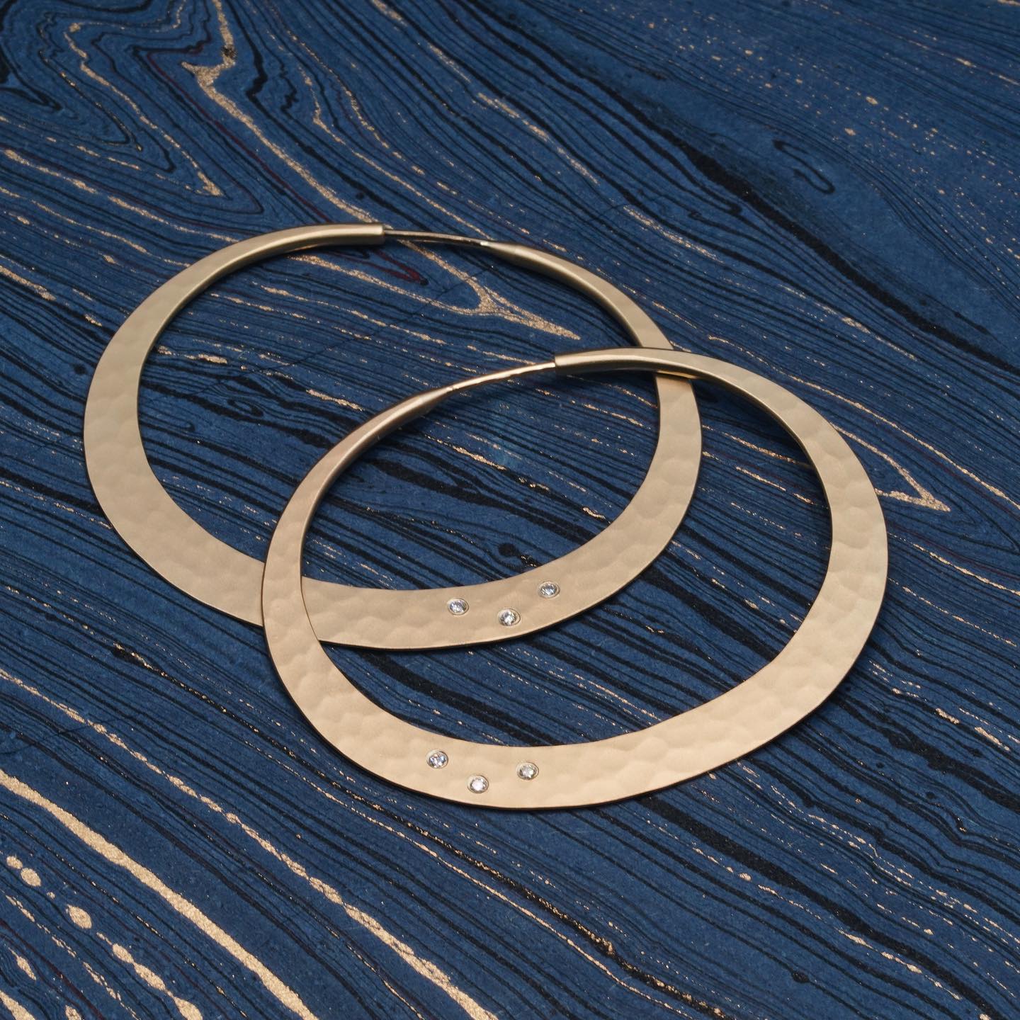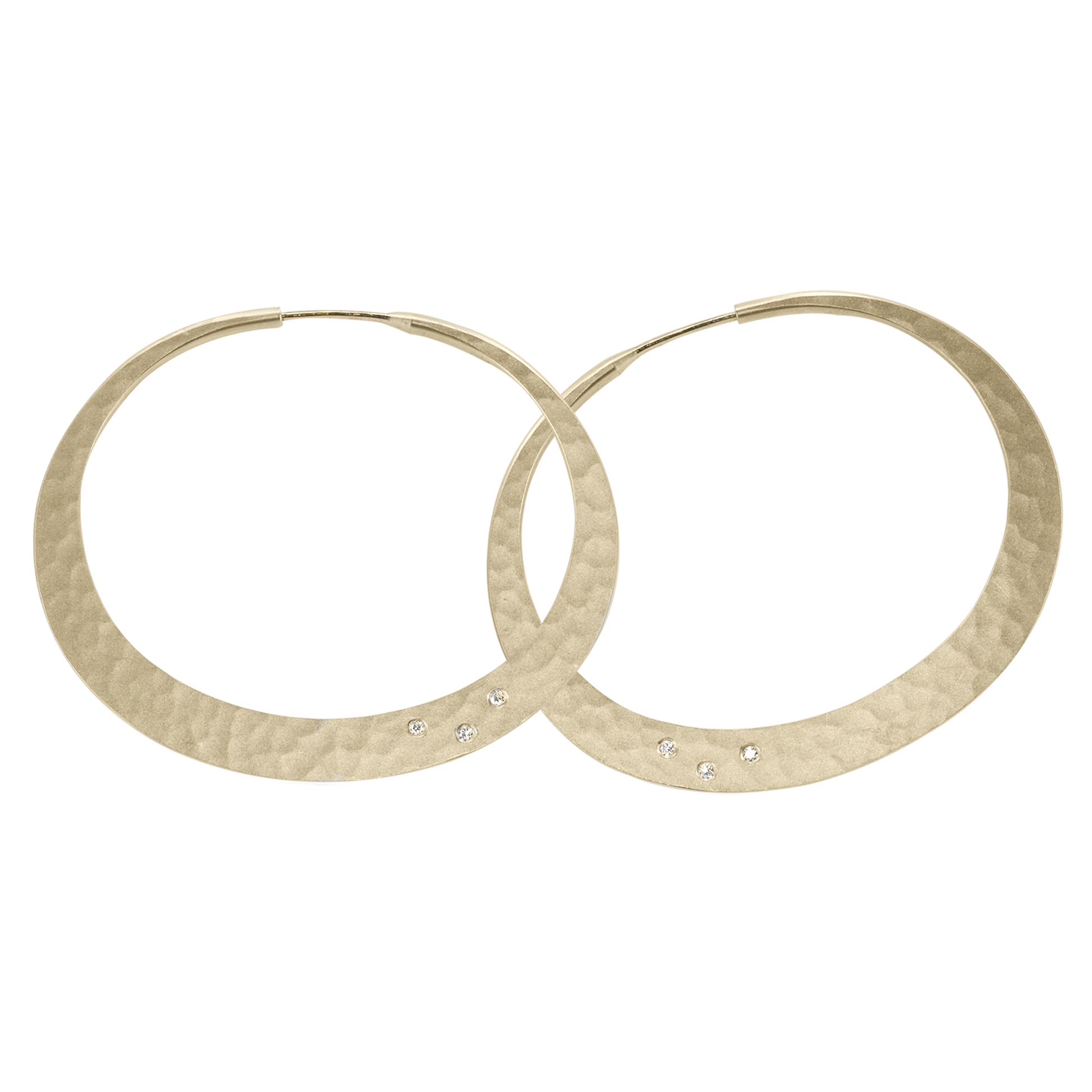 This pair of oval eclipse hoops feature a super light-weight satin matte gold with three brilliant in-set diamonds on each hoop.