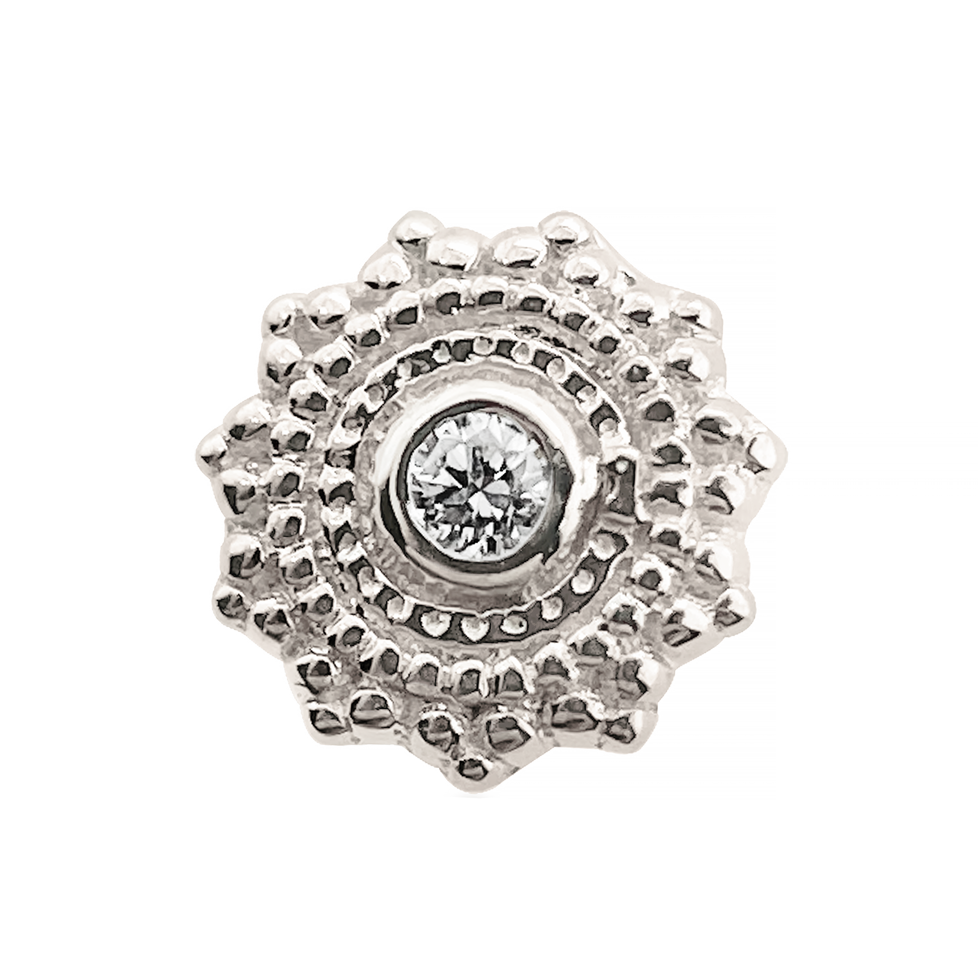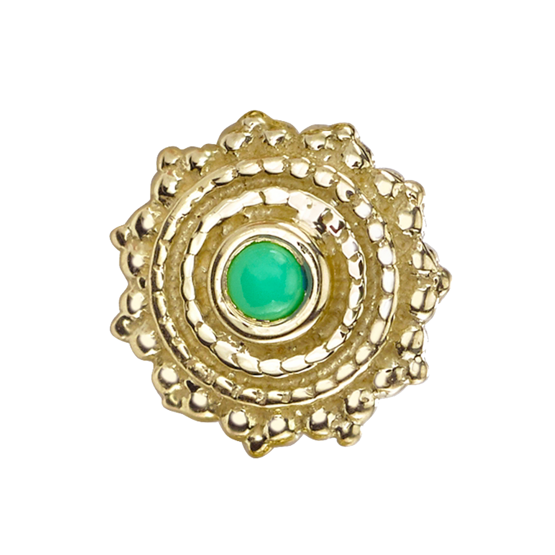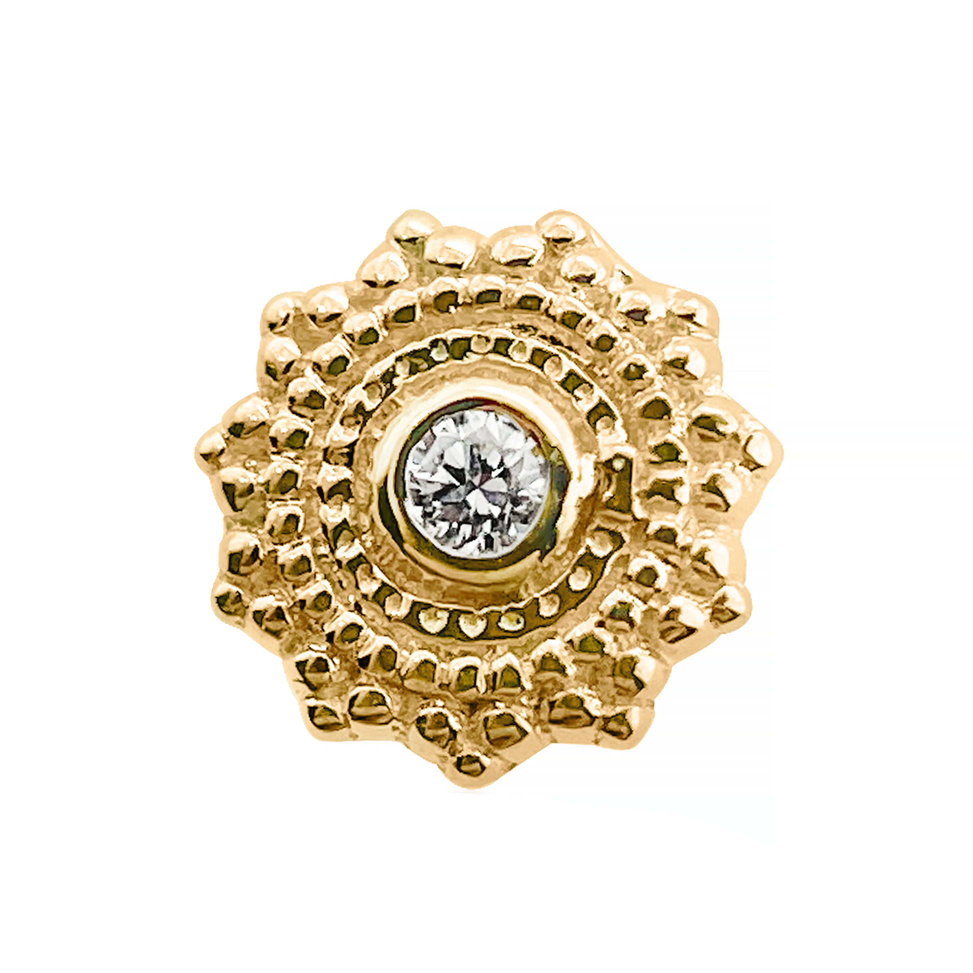 Complete with a 1.5mm stone and concentric bands of gold beading and texture, BVLA's classic Afghan threaded end is a versatile piece for those who love ornate designs and subtle shine.