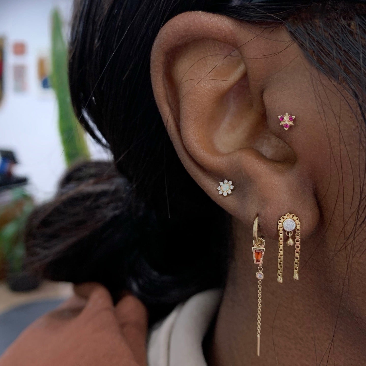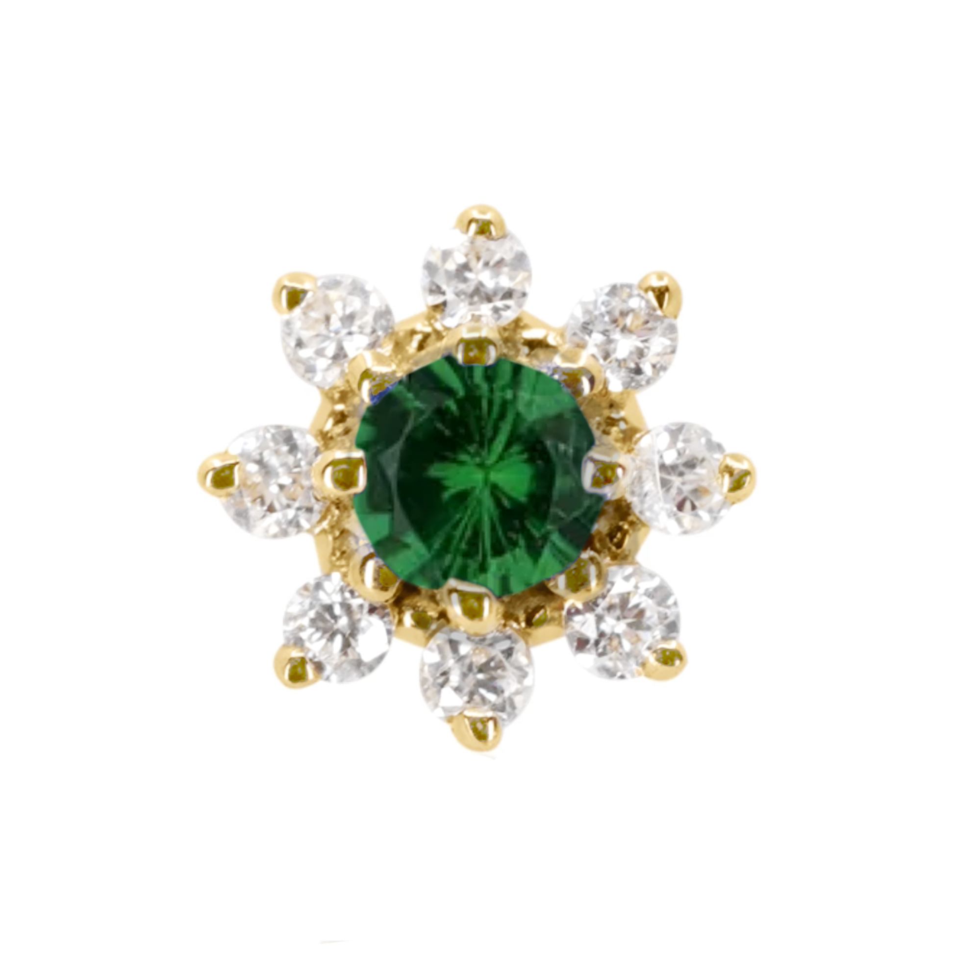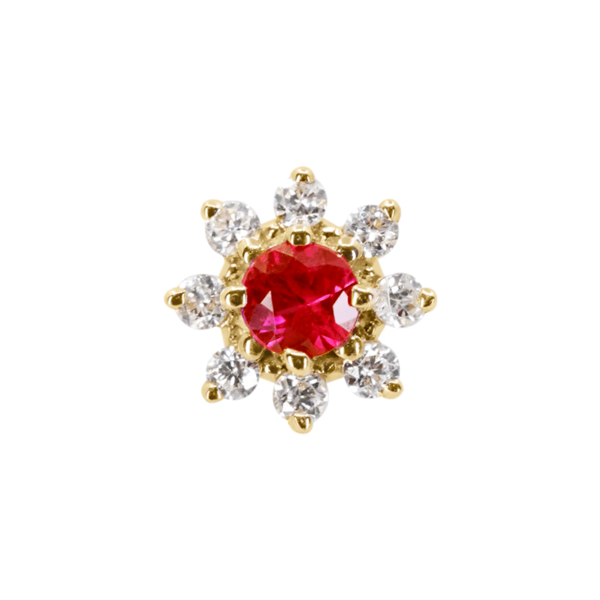 This delicate Mini Athena flower comes with your choice of gemstone in the center and a halo of eight bright diamonds. This piece is versatile due to its smaller size (4mm), making it a perfect subtle pop of color across the ear, nostril and lip piercings.