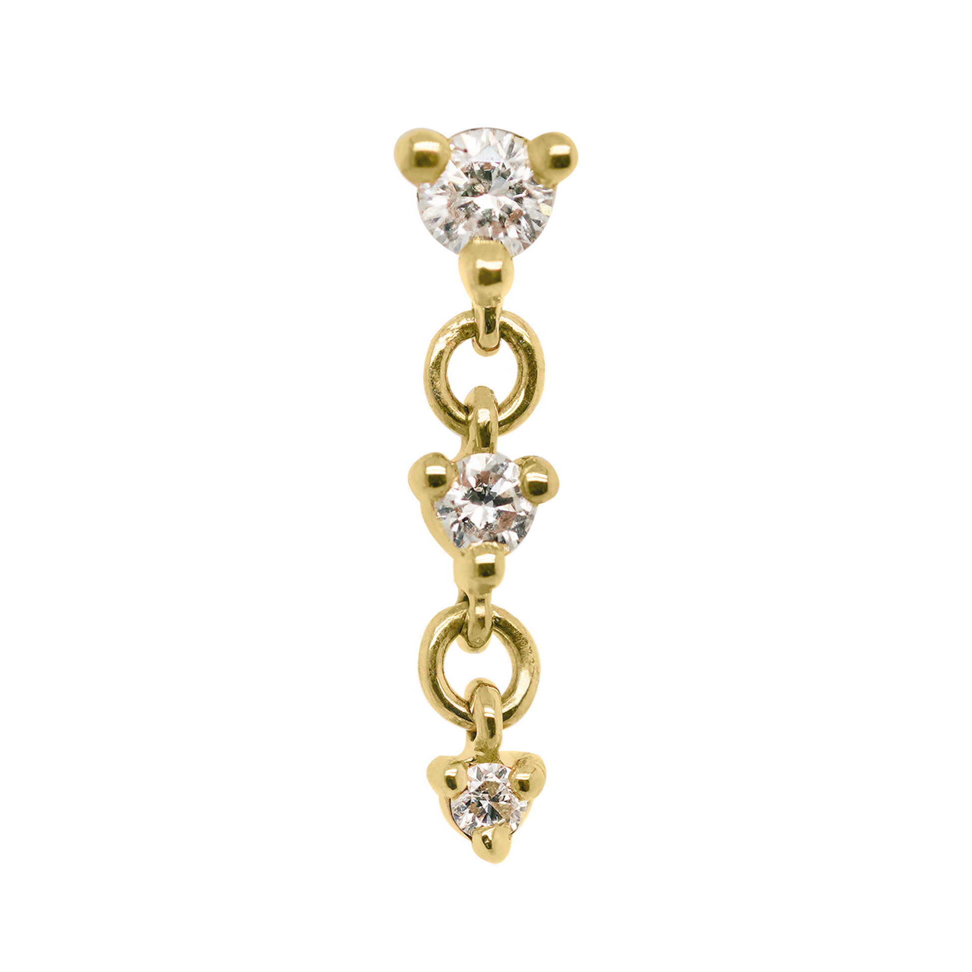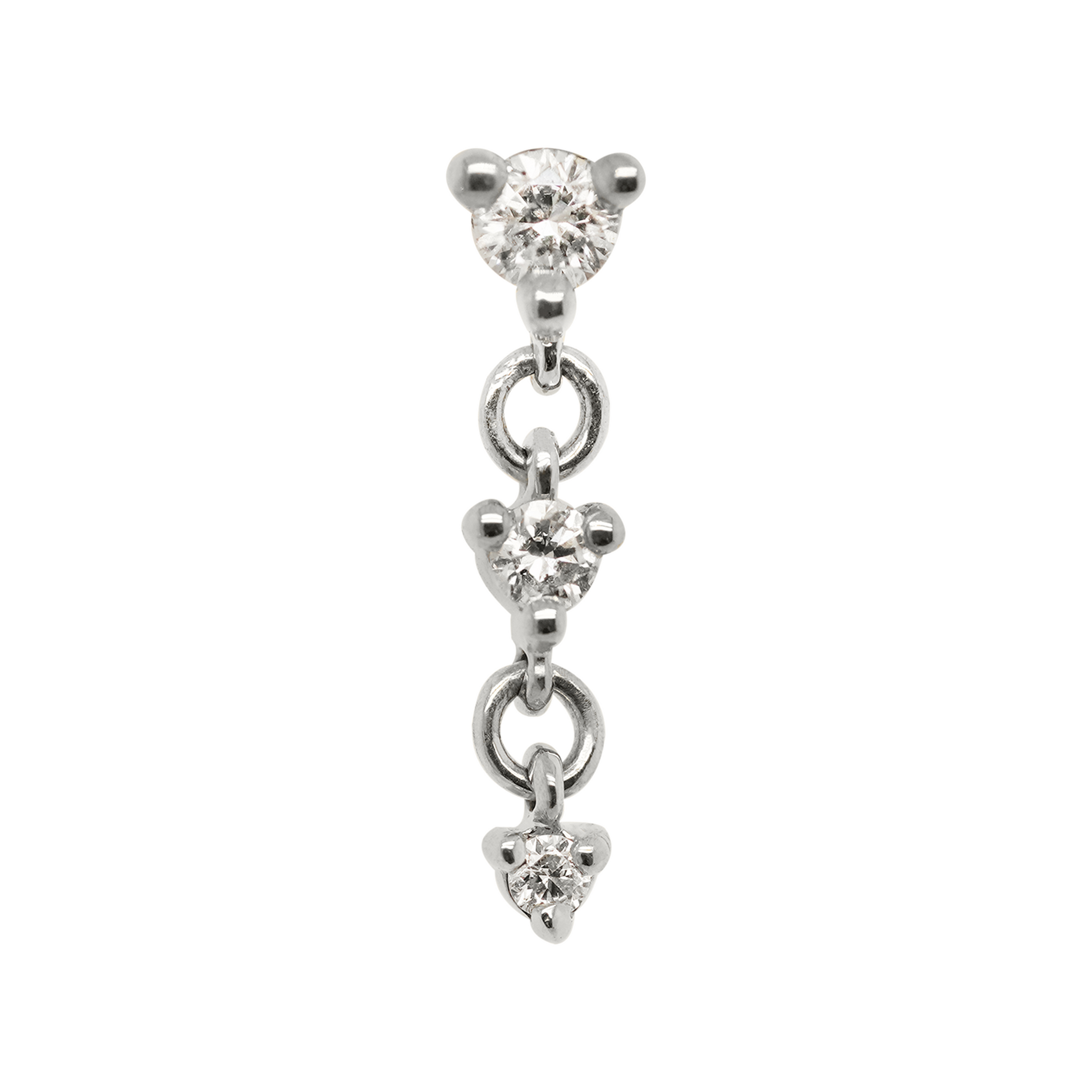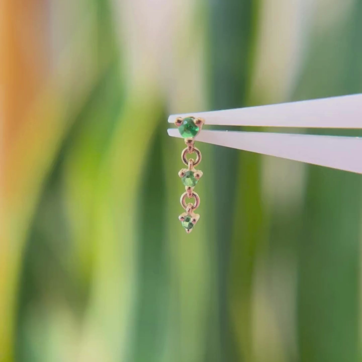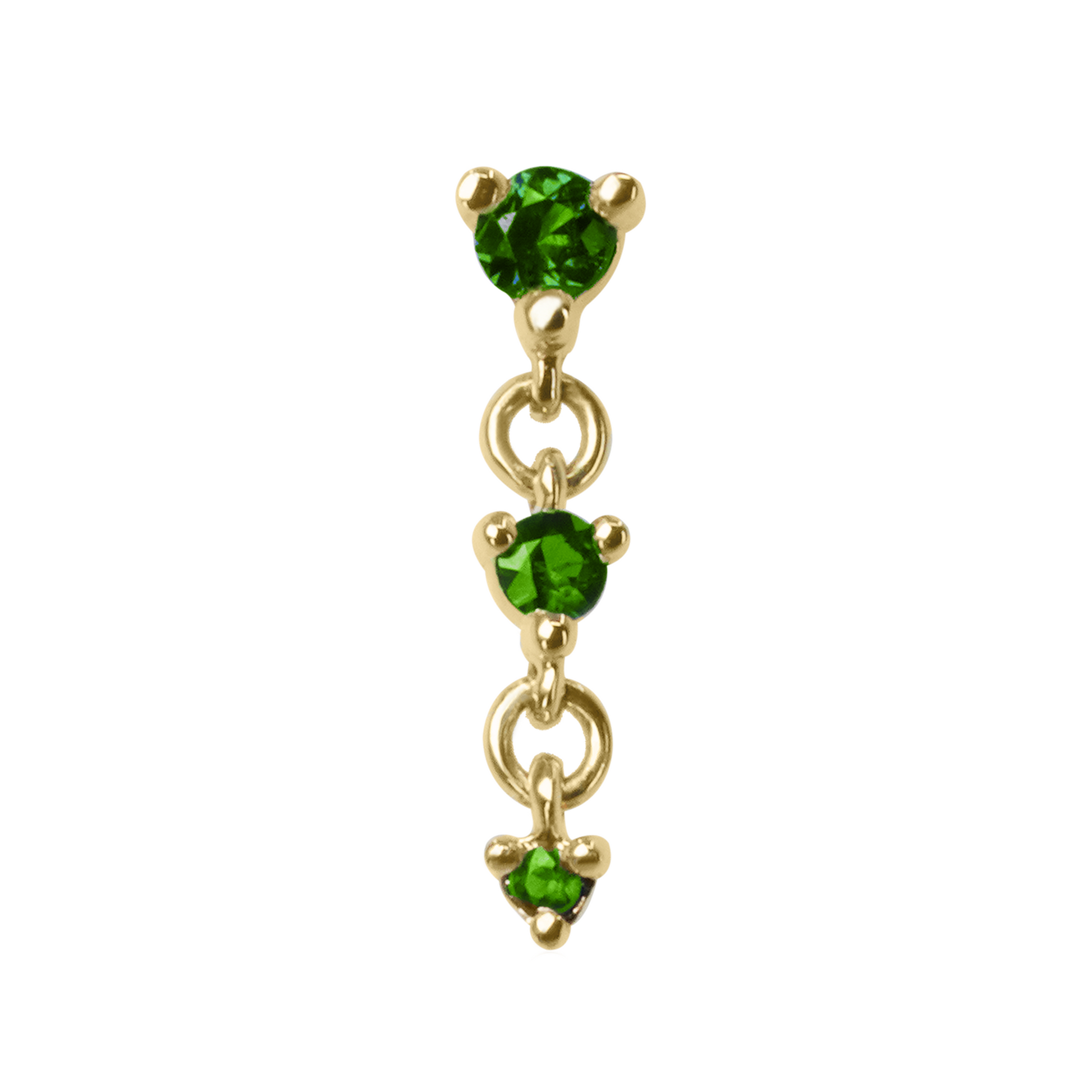 The Cascade III threadless end comes with three bright diamonds or tsavorite garnet in a cascading dangling trio. Perfect across the ear in a helix, lobe, or as a show-stopper in a flat piercing!