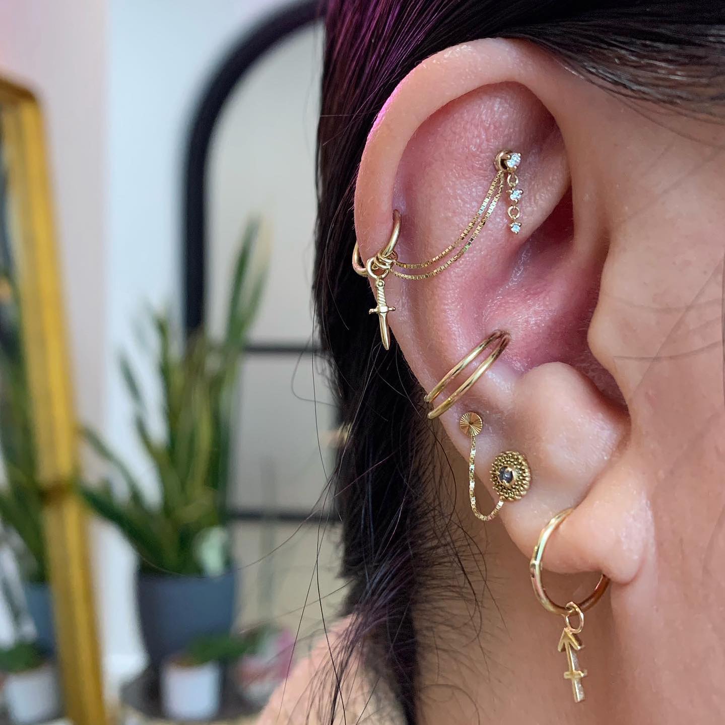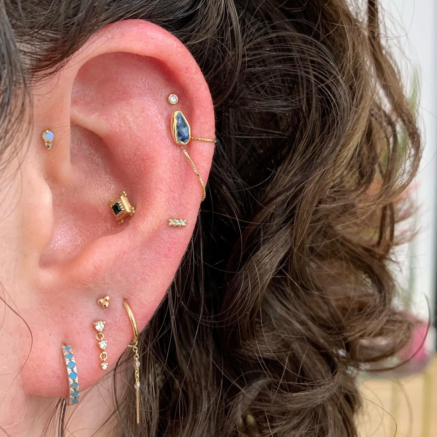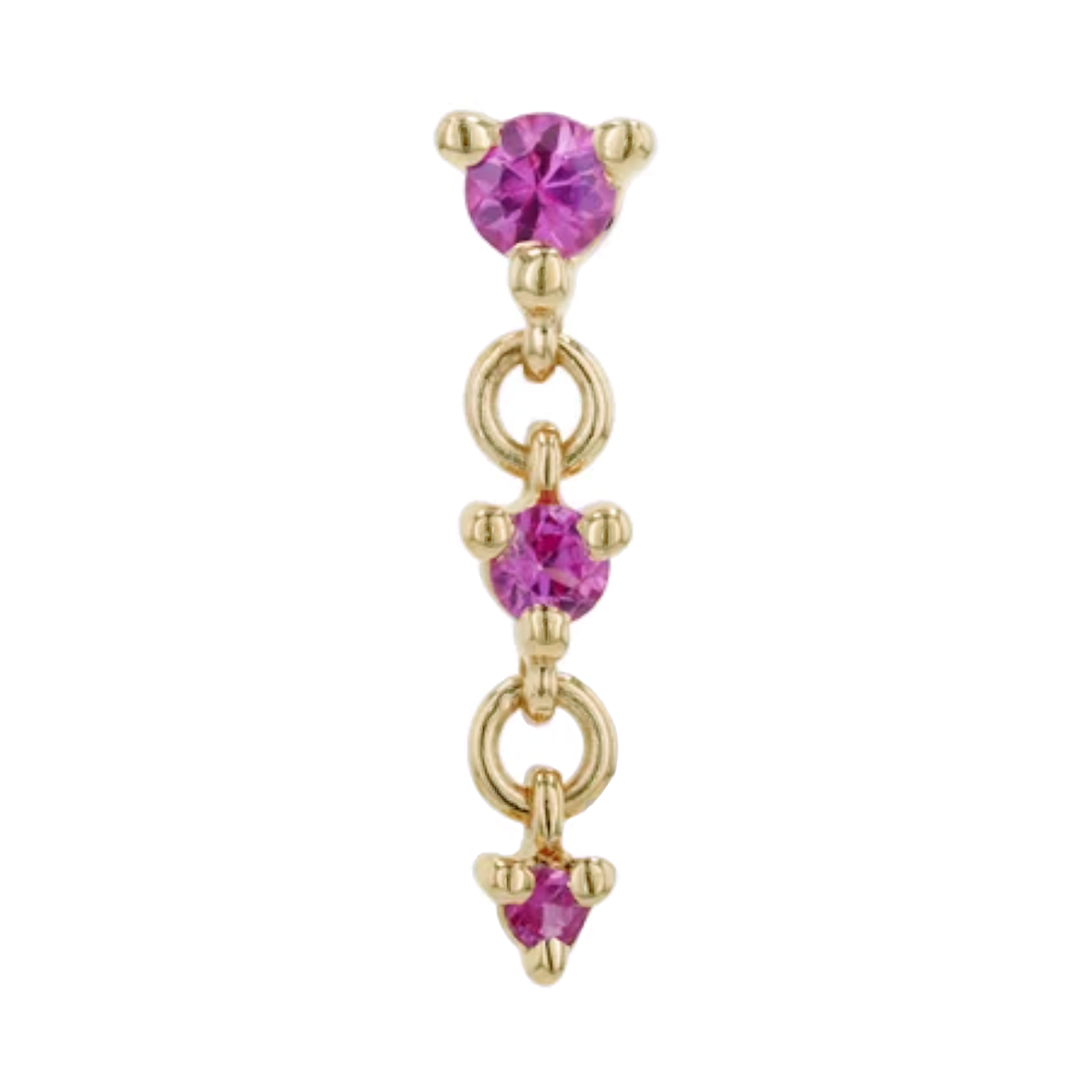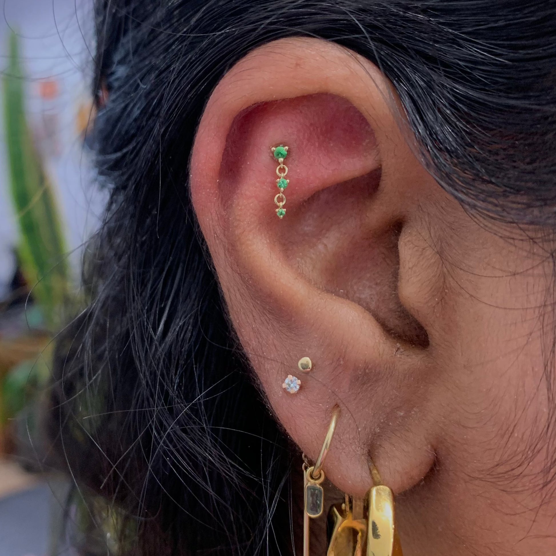 The Cascade III threadless end comes with three bright diamonds or tsavorite garnet in a cascading dangling trio. Perfect across the ear in a helix, lobe, or as a show-stopper in a flat piercing!