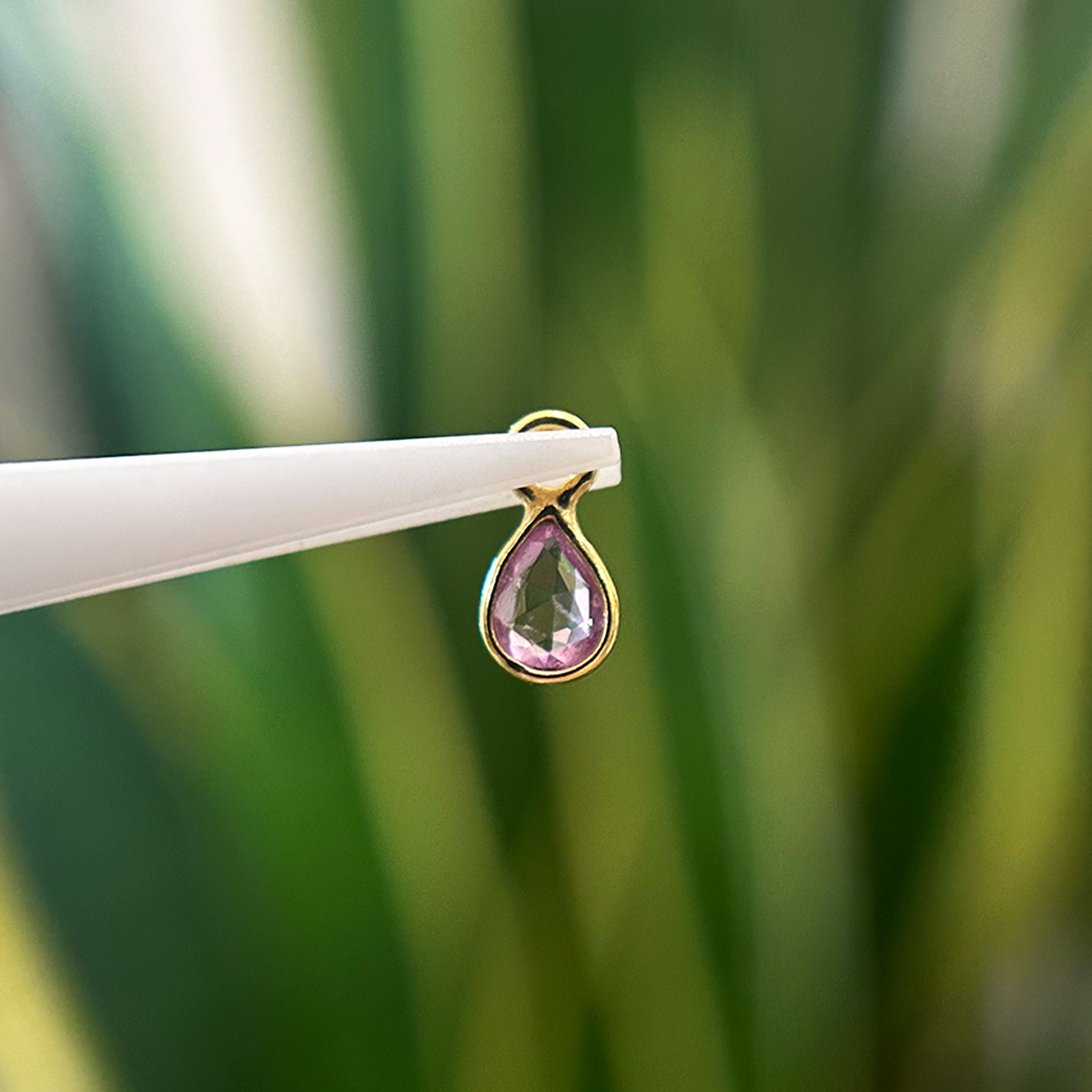 This stunning pink tourmaline oval charm is the perfect accent charm across the ear, including the rook, helix, and lobe piercings on a simple ring.