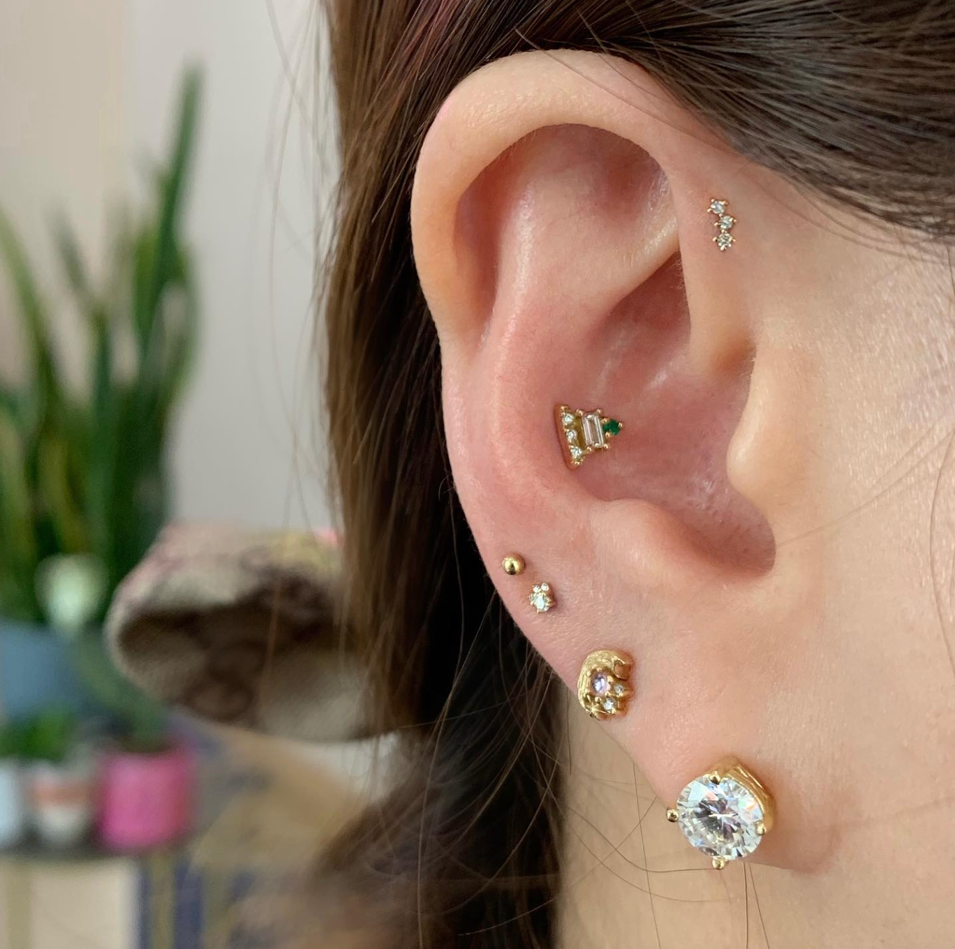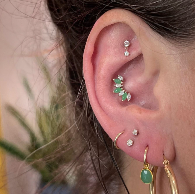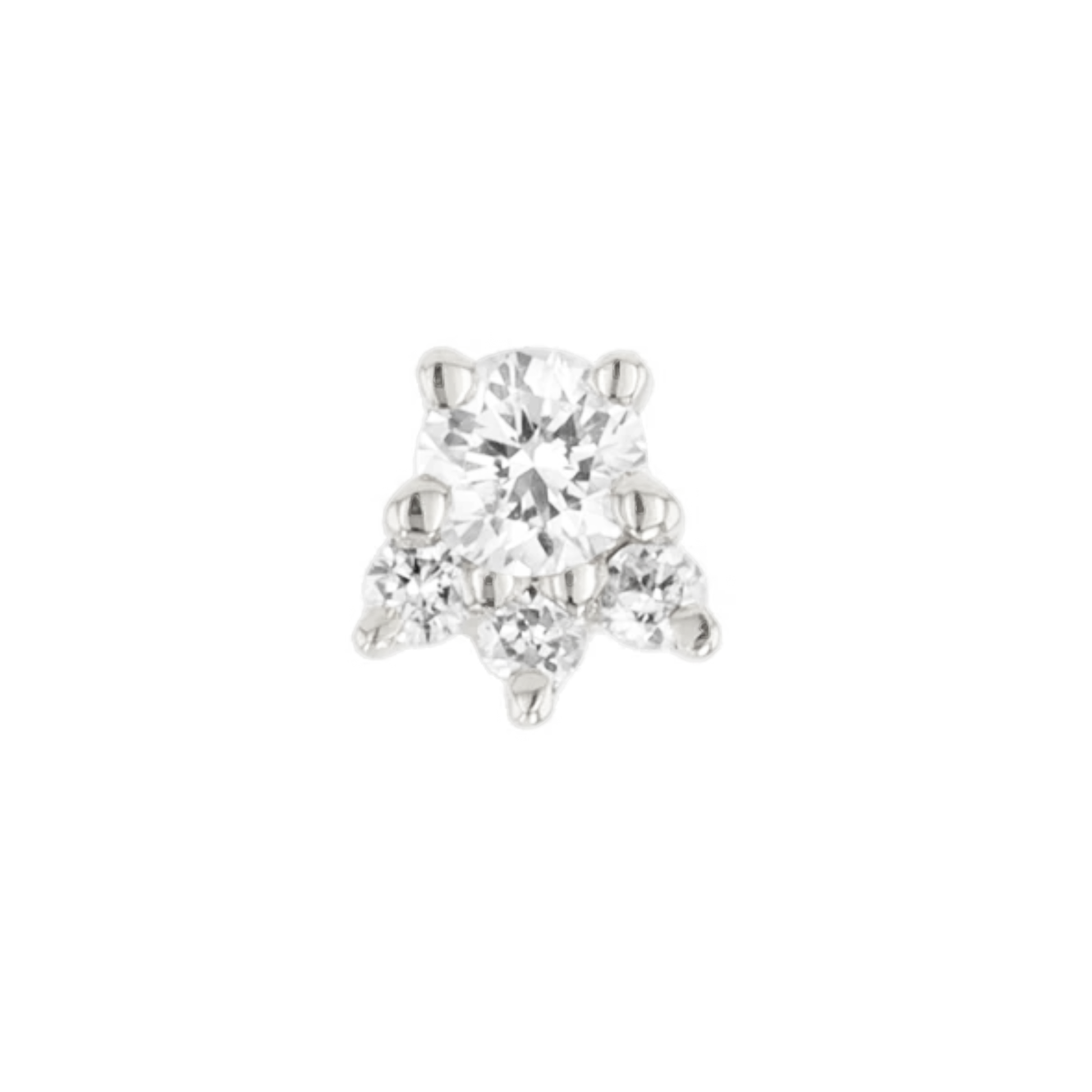 The Mini Leia is a super delicate version of their popular design with a center white diamond with three tiny diamond accents. Its small size makes it a perfect addition to most piercings including lobes, forward helix, tragus, and nostril piercings!