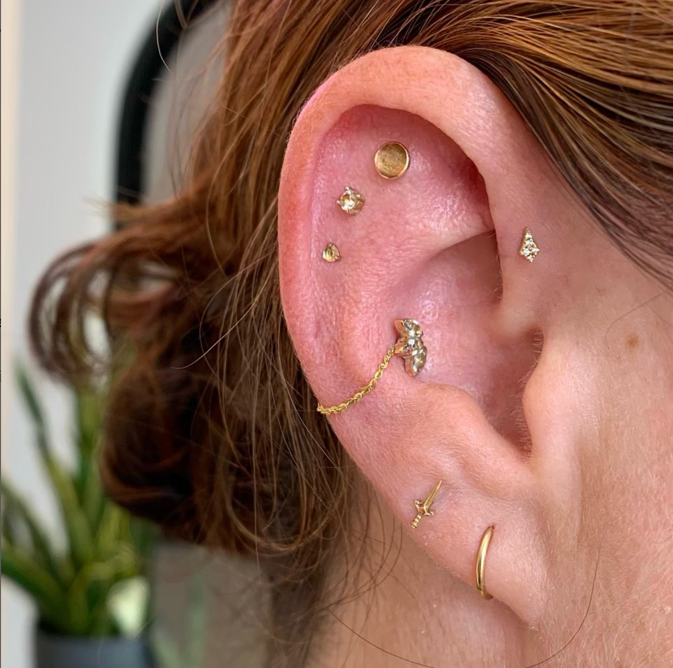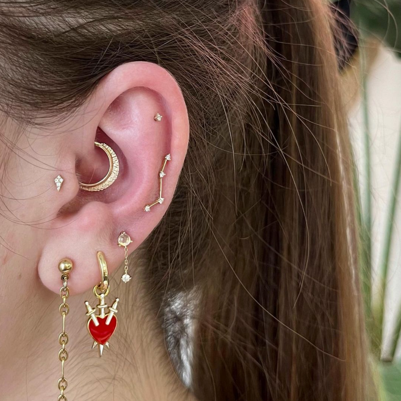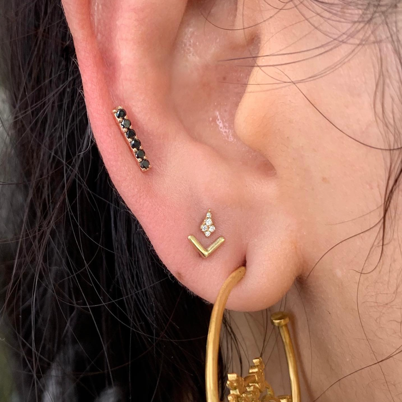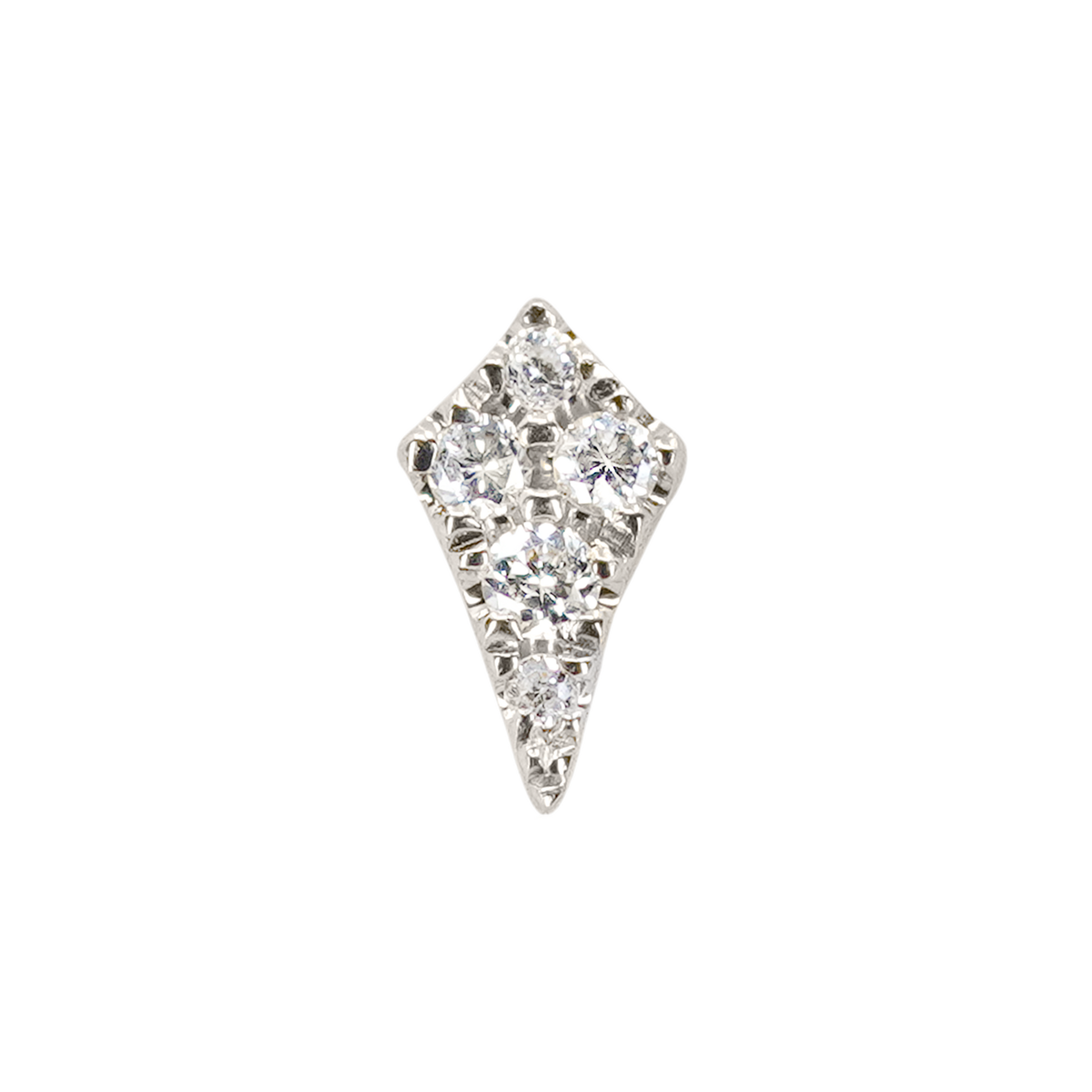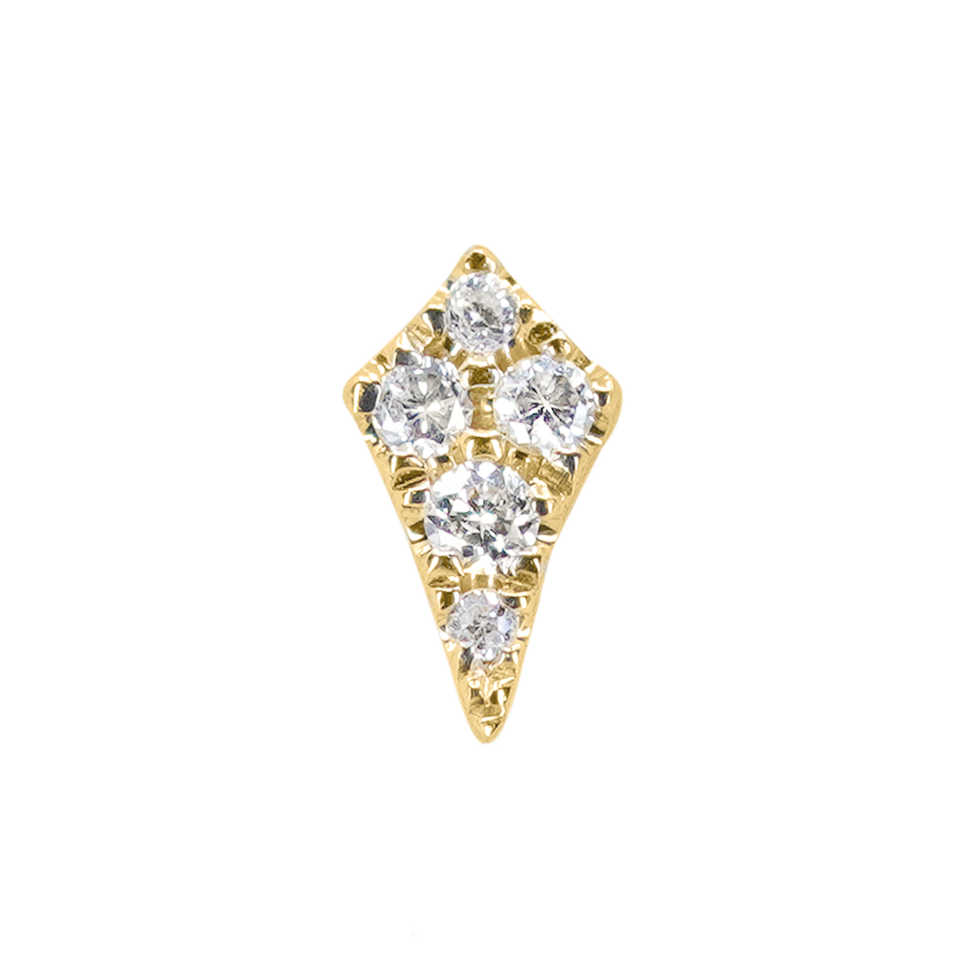 The Lucy is a delicate kite-shaped gold stud with five diamond pavé detailing. Its low profile setting and tapered shape make it a wonderful fit for tragus, forward helix, and even nostril piercings.
