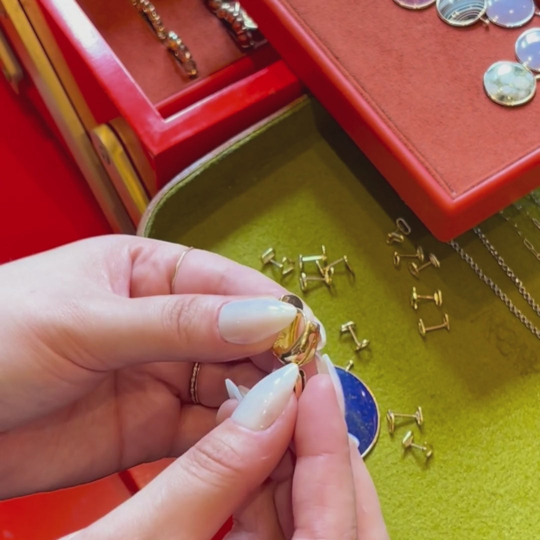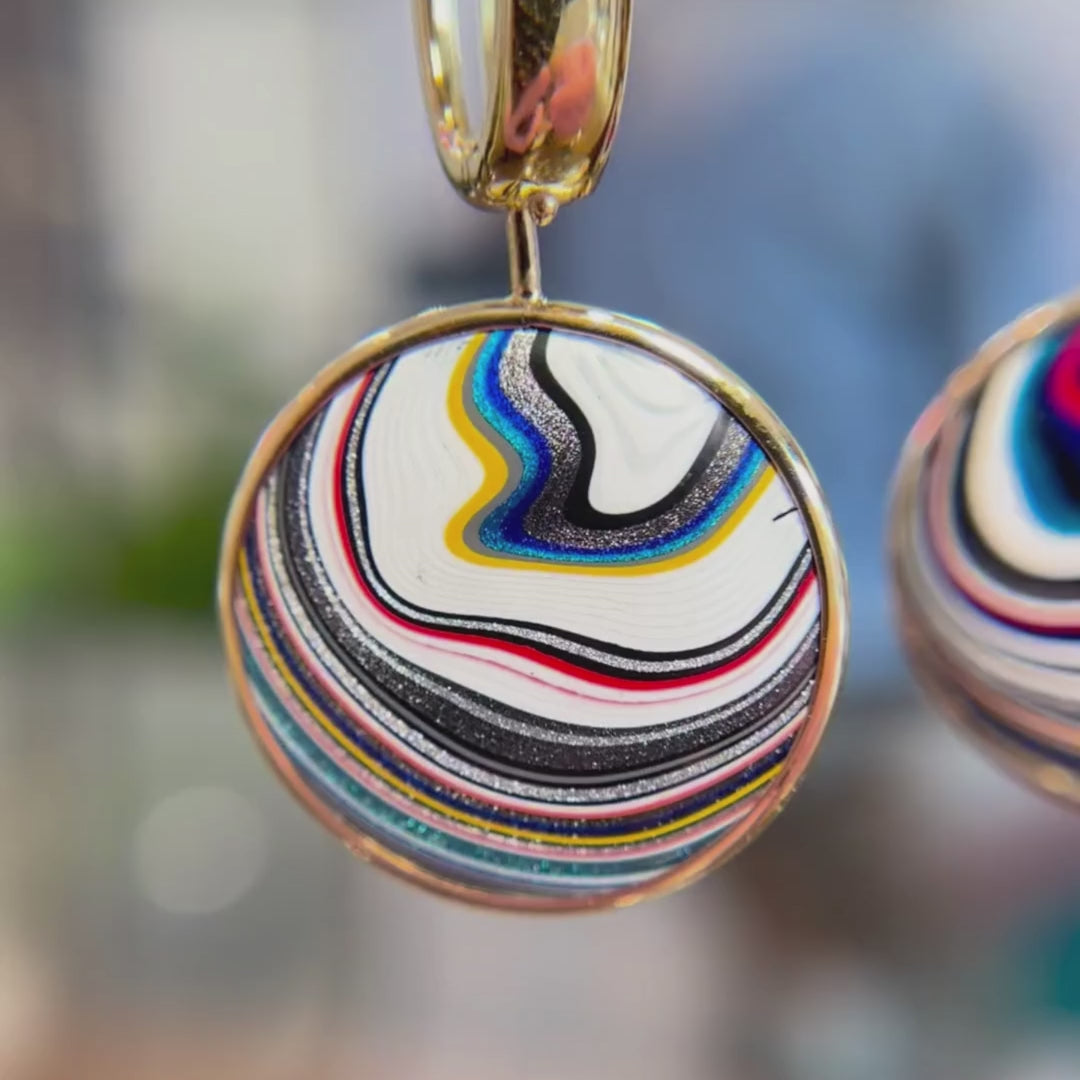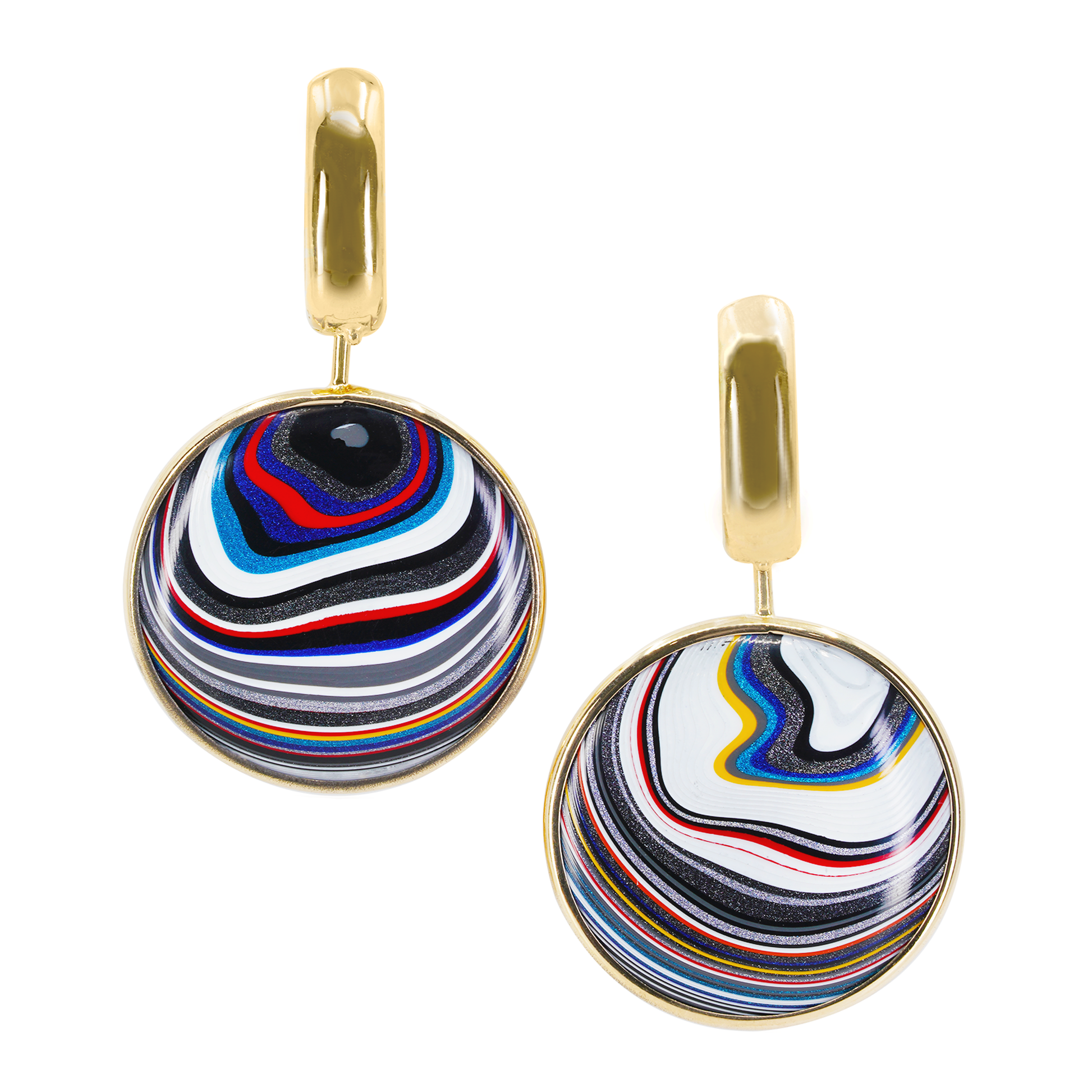 These statement earrings from Marla Aaron are some of our favorites. These gold earrings come with discs of vibrant Fordite that can be removed from the earring bases (see the video we've included in the product images!) and mixed and matched with different lozenges from the designer.