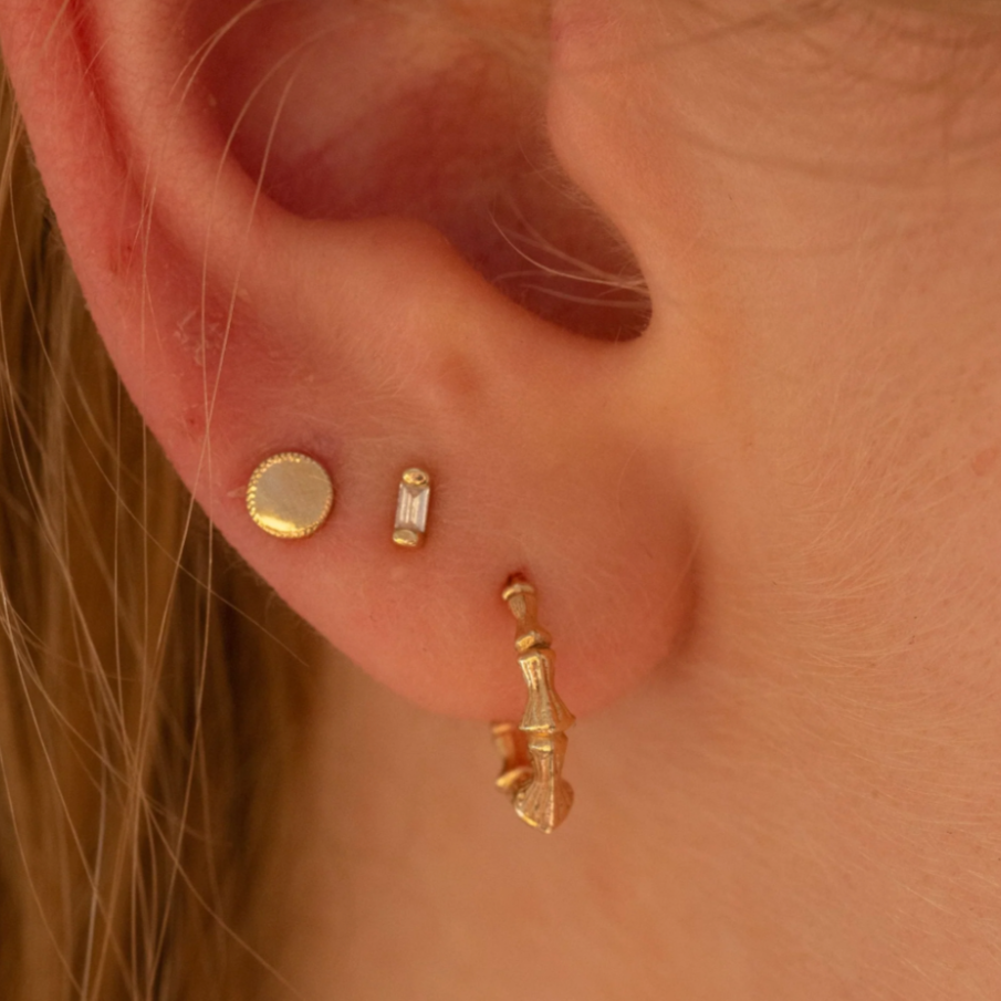 "Sometimes that little sparkly accent is all your ear really needs. A single petite baguette, prong set and perfect for joining in on your existing earring collection or a stand out on its own."