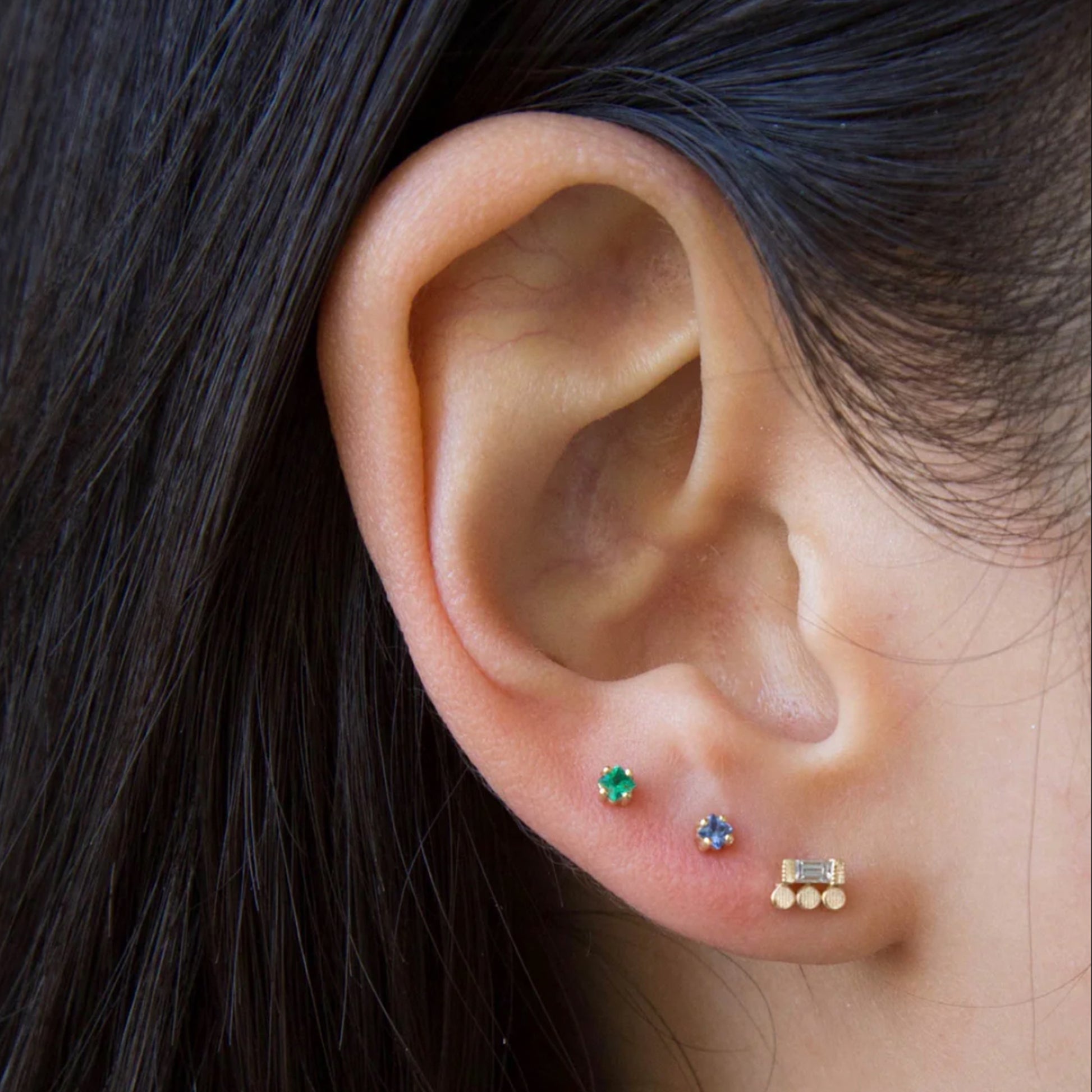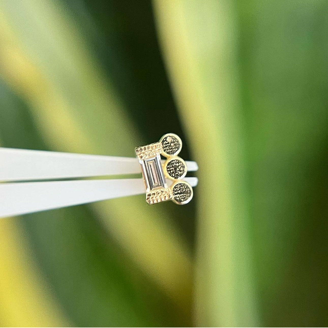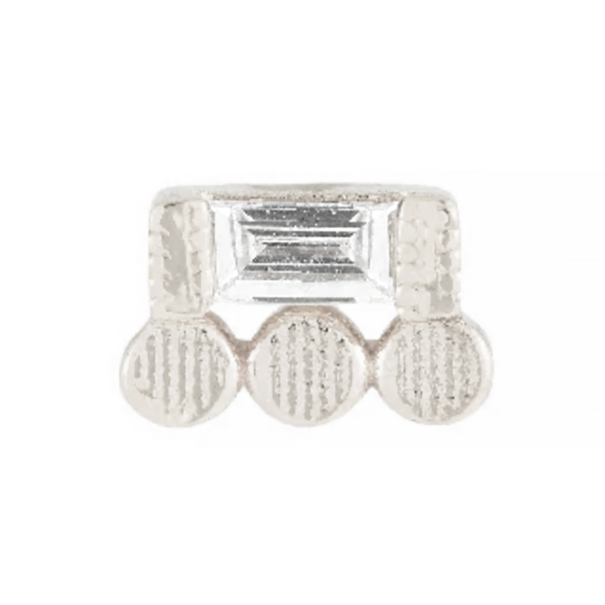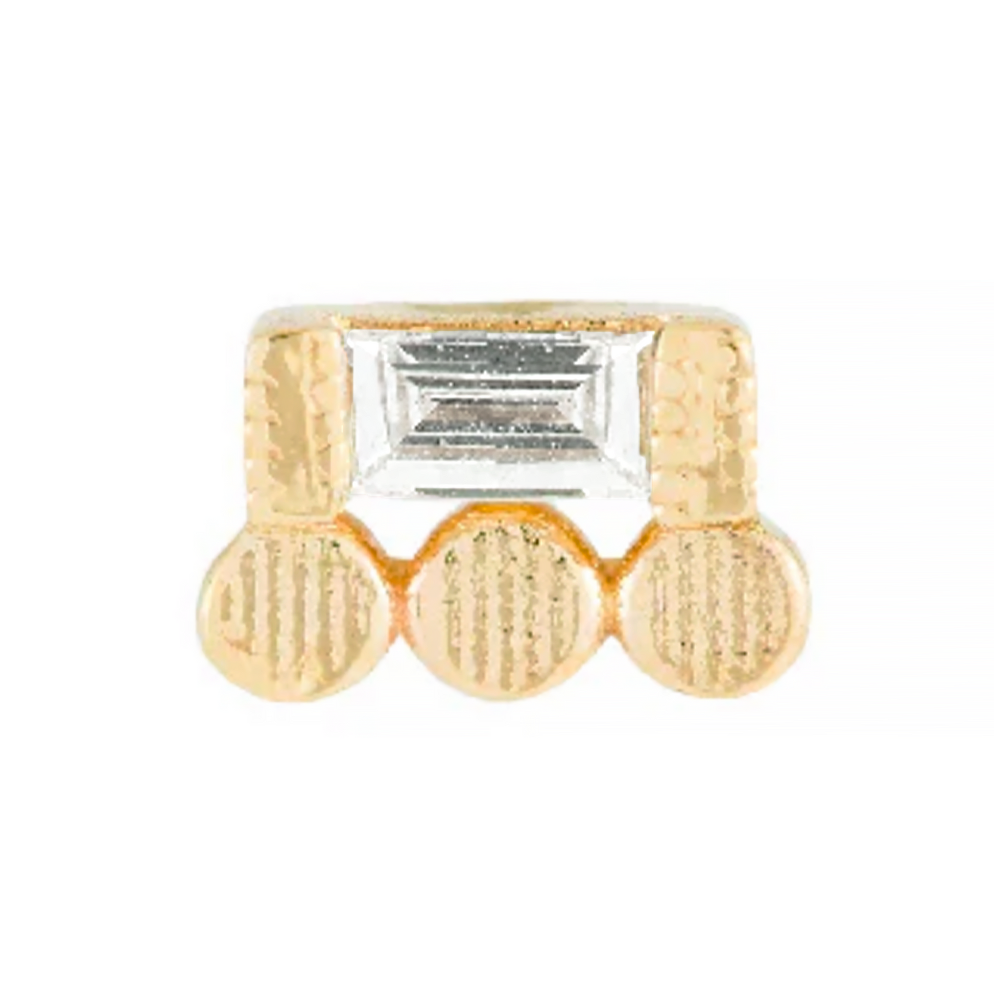 A sweet and delicate everyday piece from our exclusive body jewelry collection with Jennie Kwon. Featuring a baguette diamond accented by three small circles, this threadless end will add both texture and sparkle to your look.