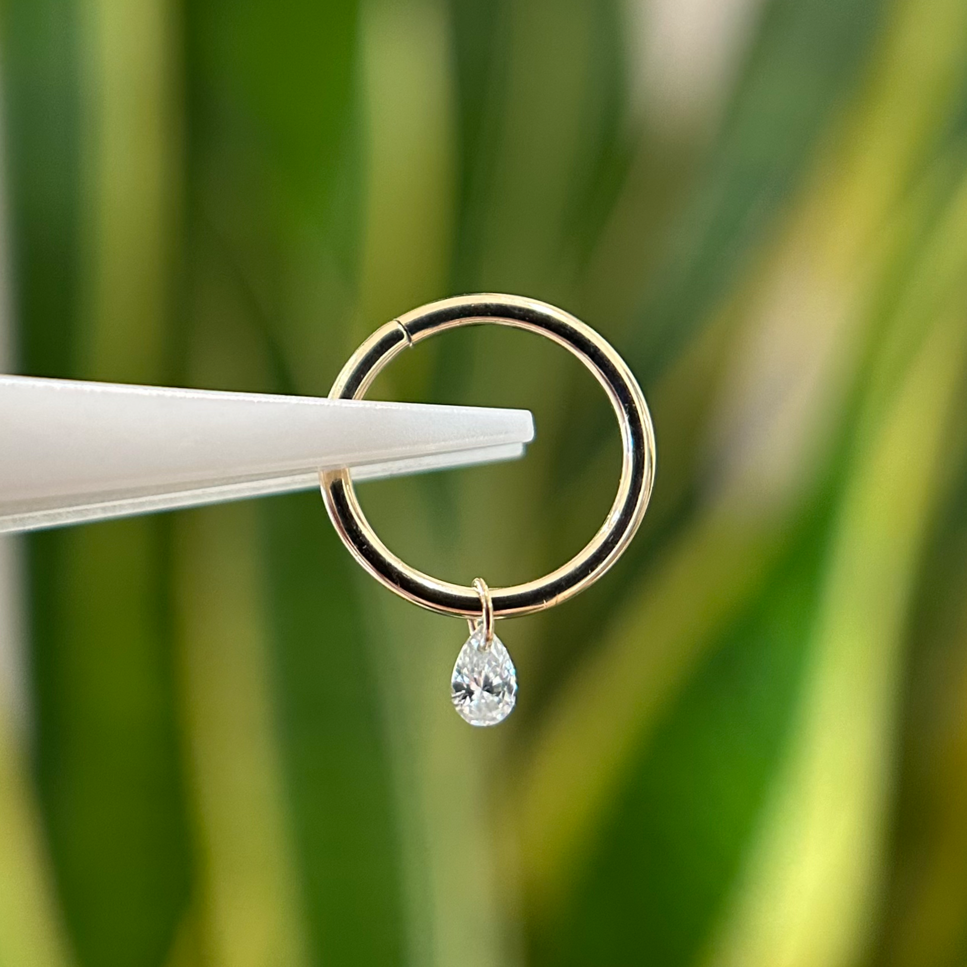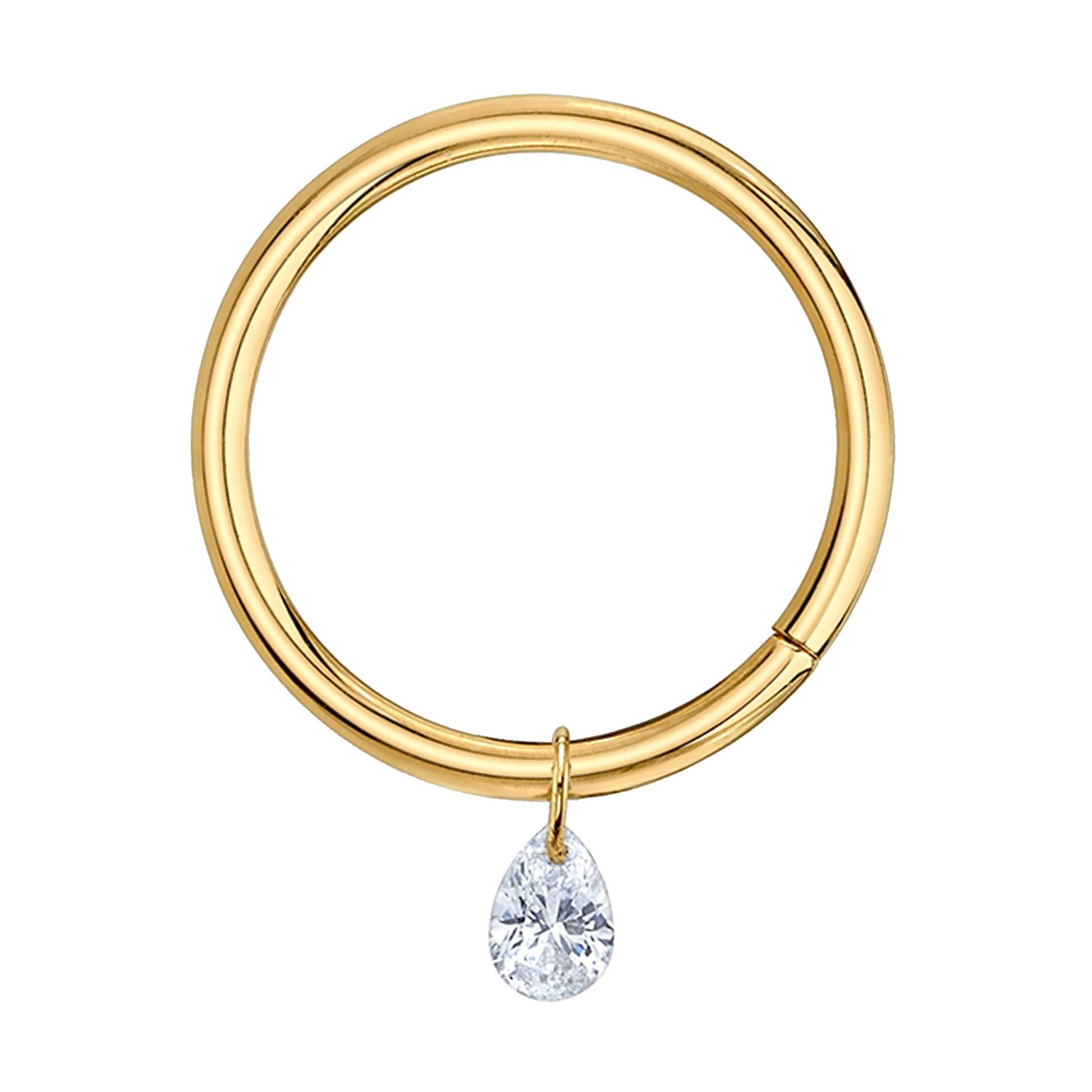 New in from BVLA! This classic 18ga seam ring is adorned with a drilled pear diamond charm for some dazzling floating sparkle.
