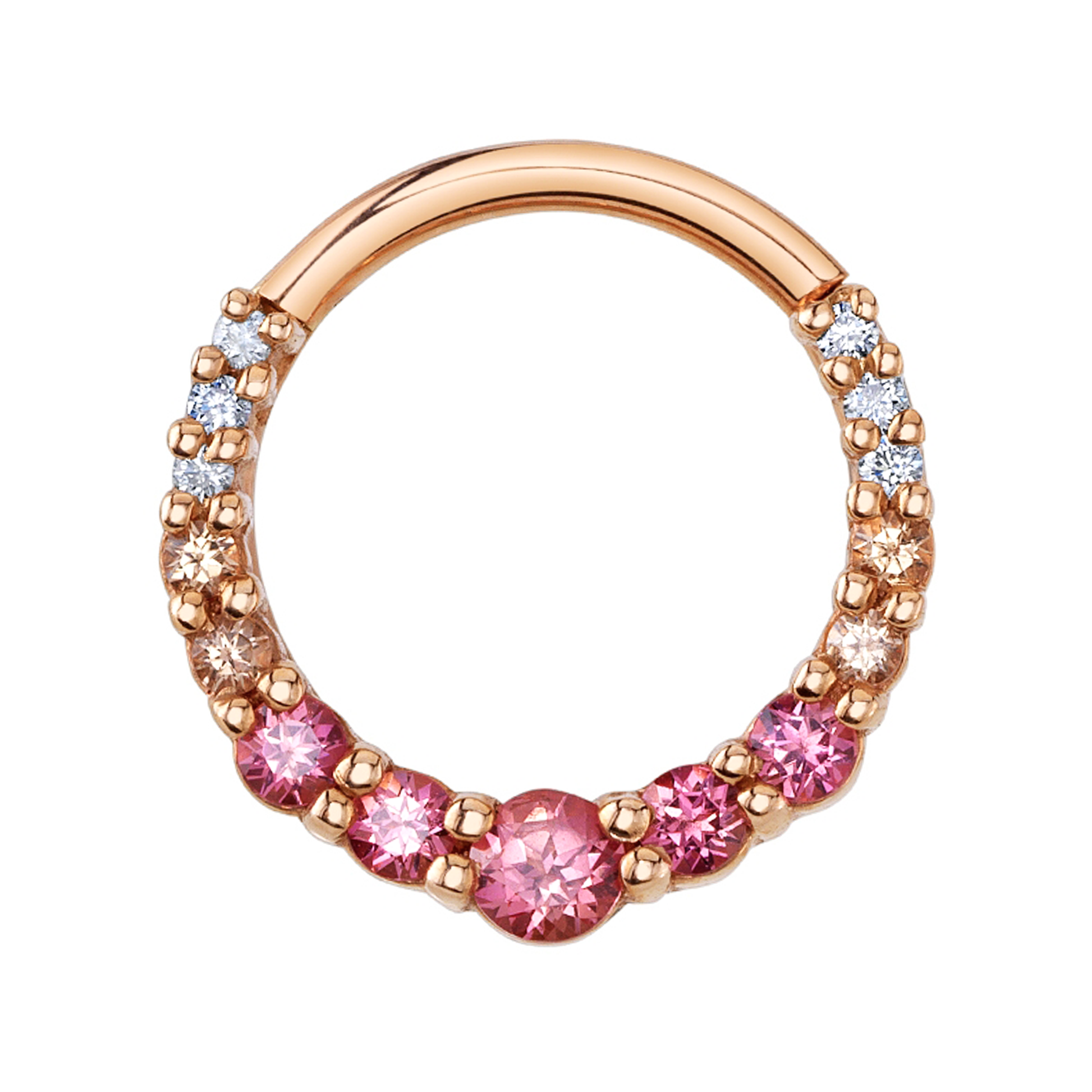 New in from BVLA! This Graduating Oaktier hinge ring features an ombré gradation of white diamonds, lab created champagne sapphires and lab created Padparadscha sapphires, set in complimentary rose gold.