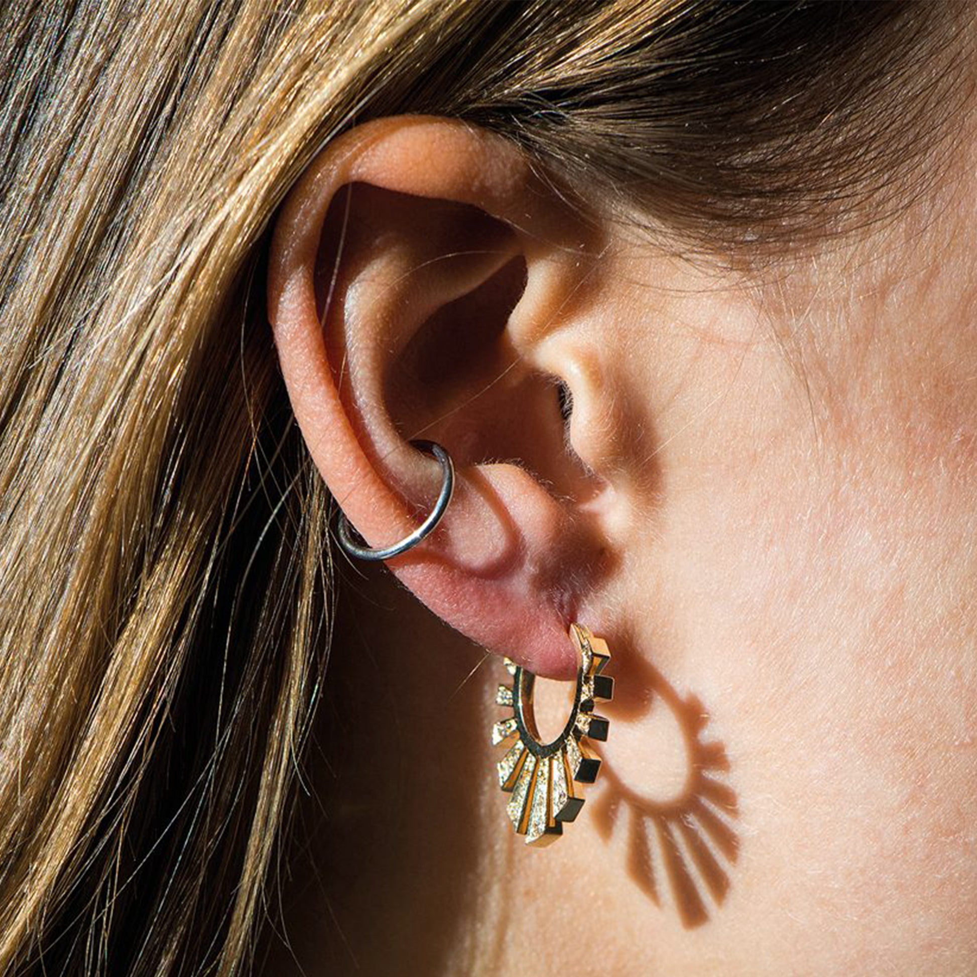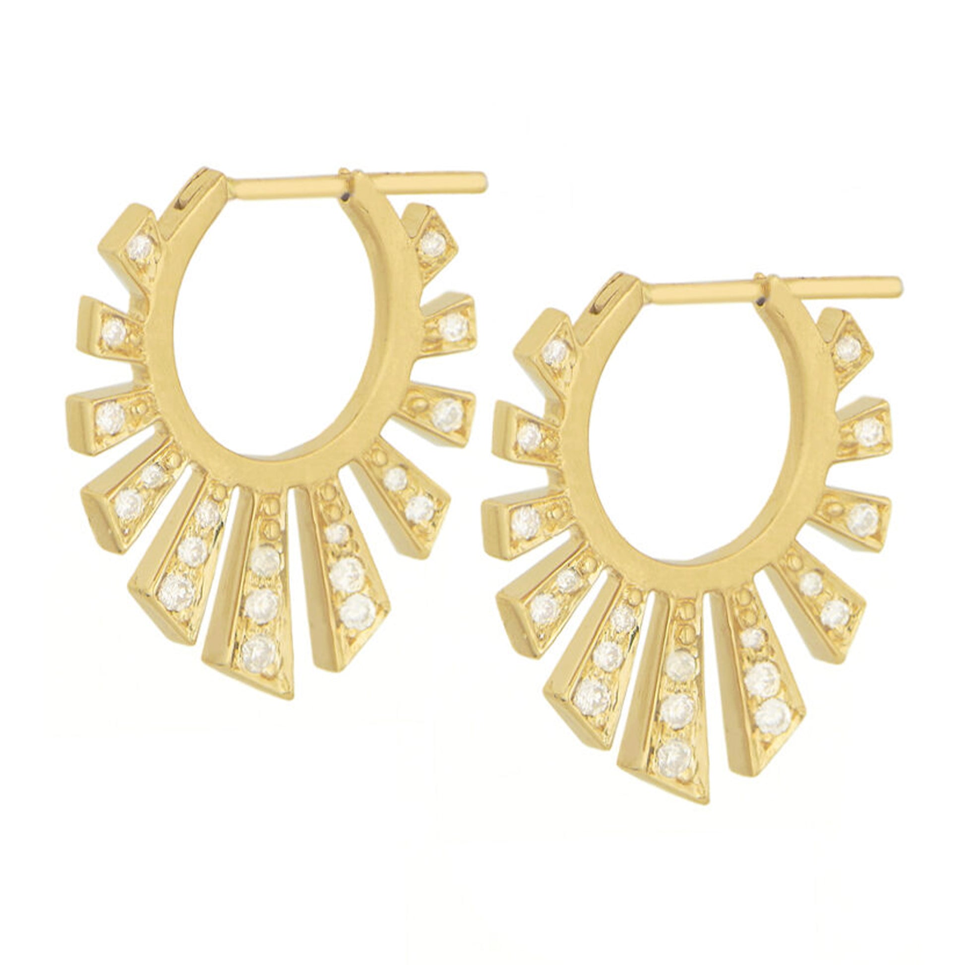 From Dutch fine jewelry designer Celine Daoust, these bold sun ray hoops are hand crafted in solid gold and flooded with diamonds.