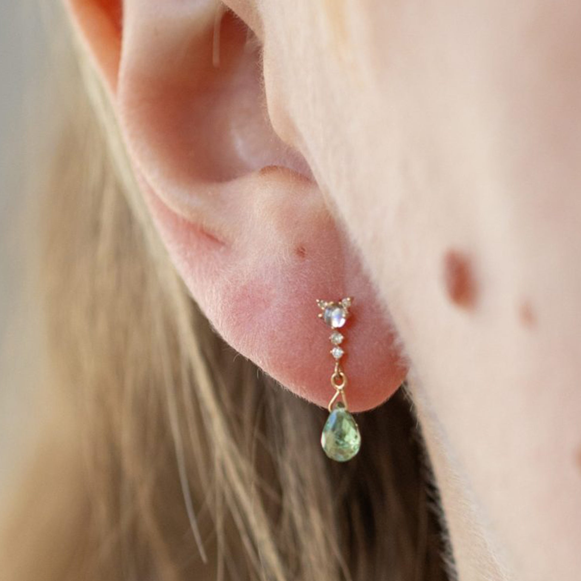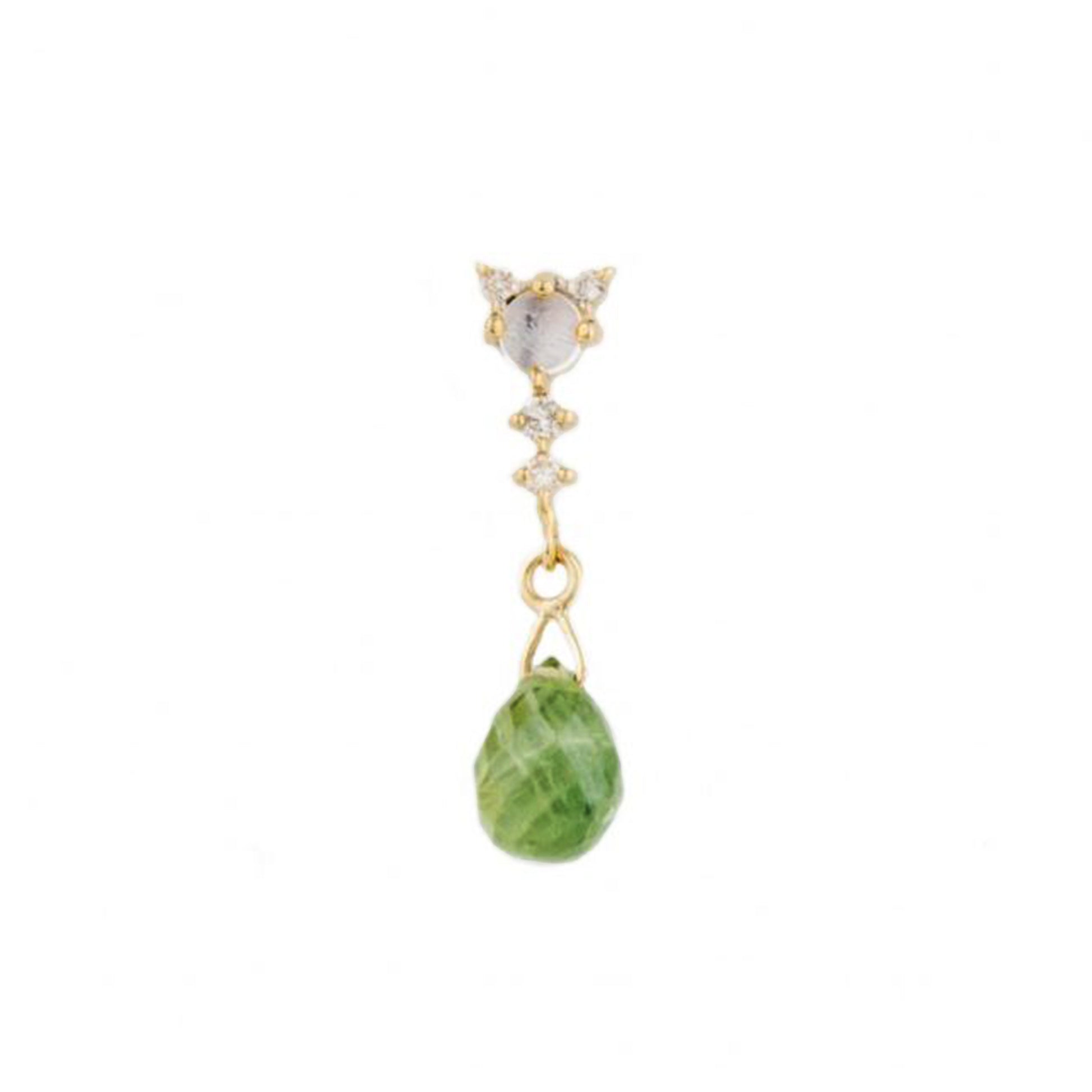 From Dutch fine jewelry designer Celine Daoust, this delicate single earring is hand crafted in 14k yellow gold and features dangling green sapphire briolette, moonstone and diamond accents.