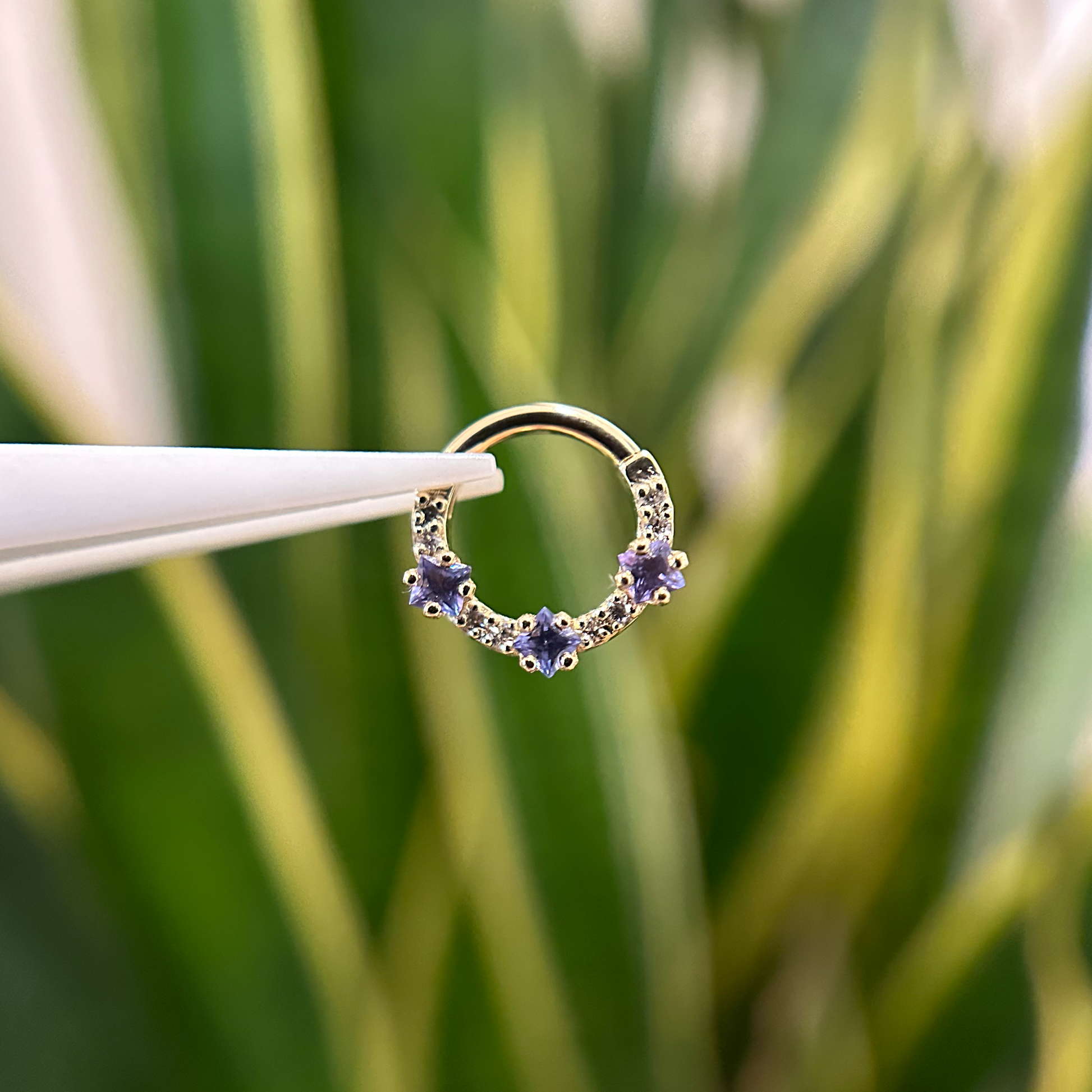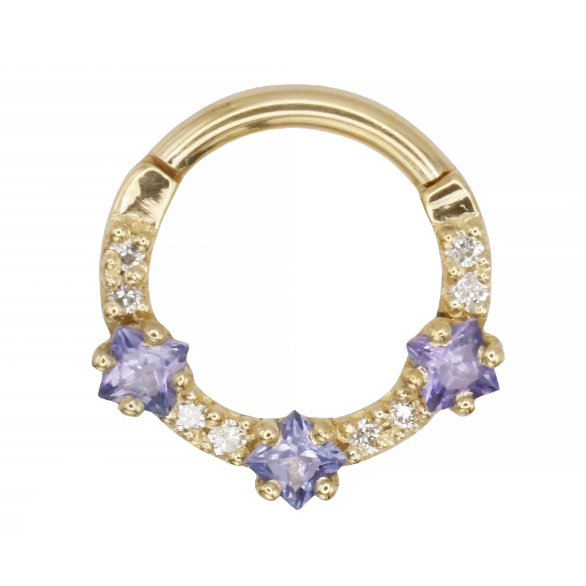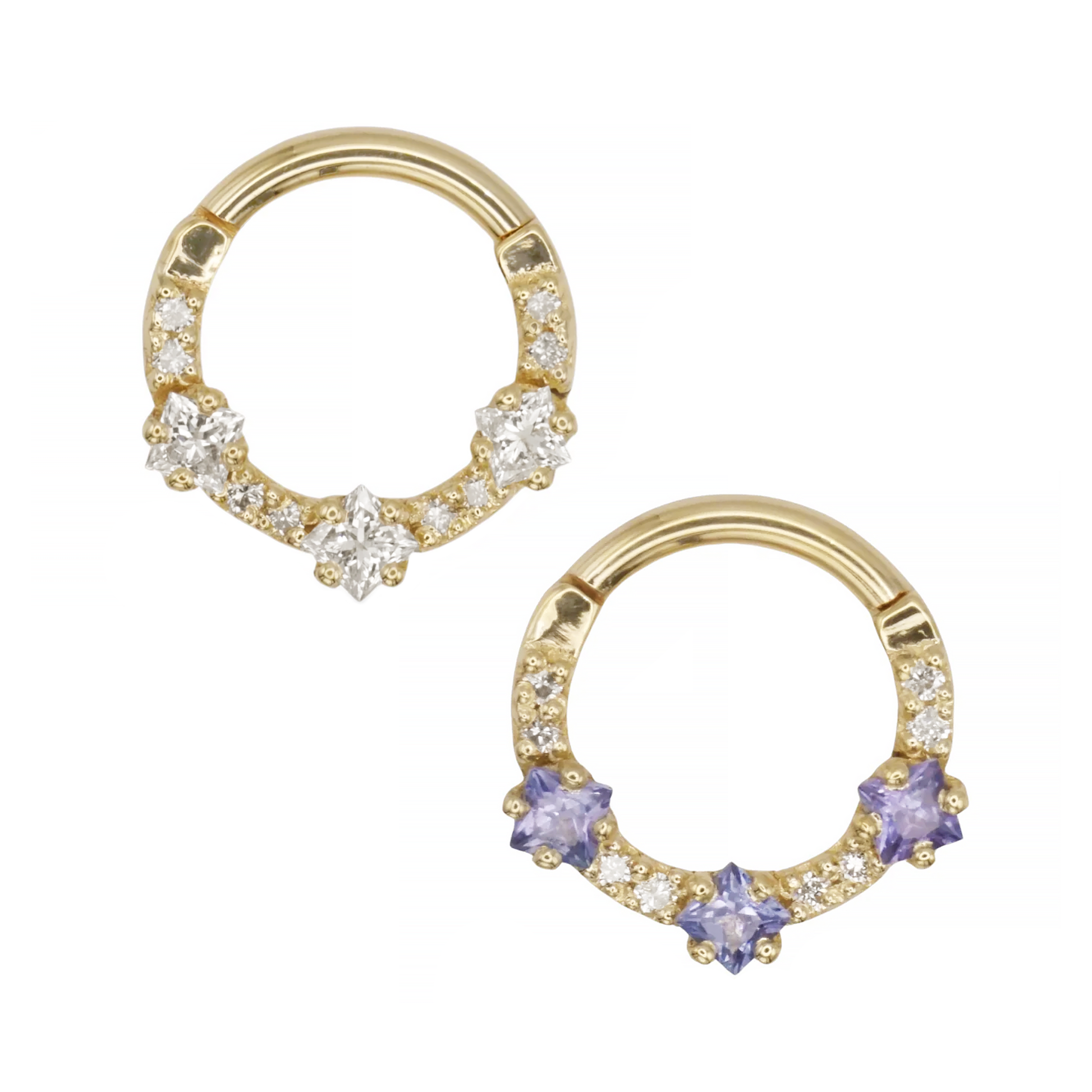 New in from Seasons! The Composer hinge ring has your choice of princess cut genuine tanzanite or lab grown white diamonds, with pavé lab grown diamonds, all set in yellow gold.