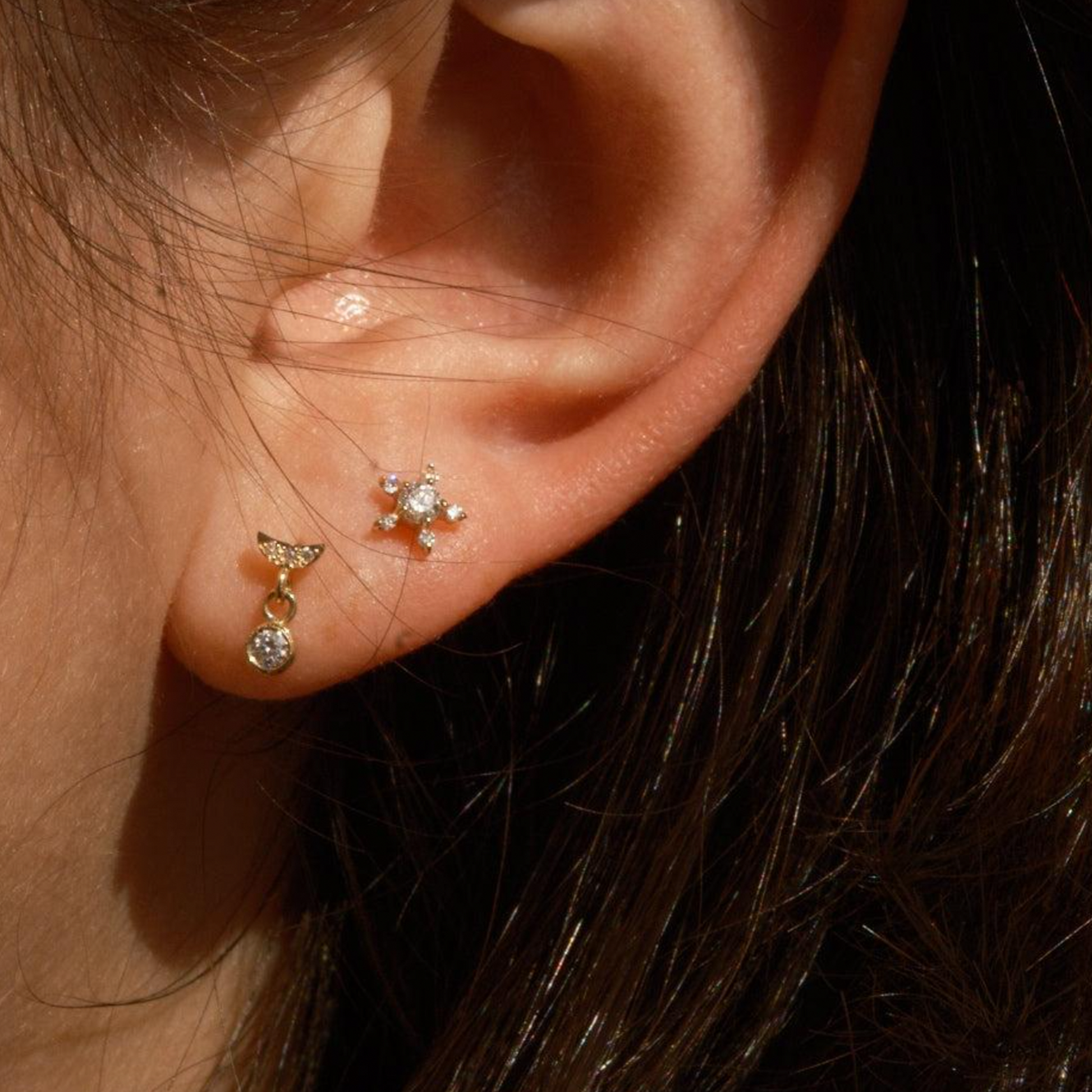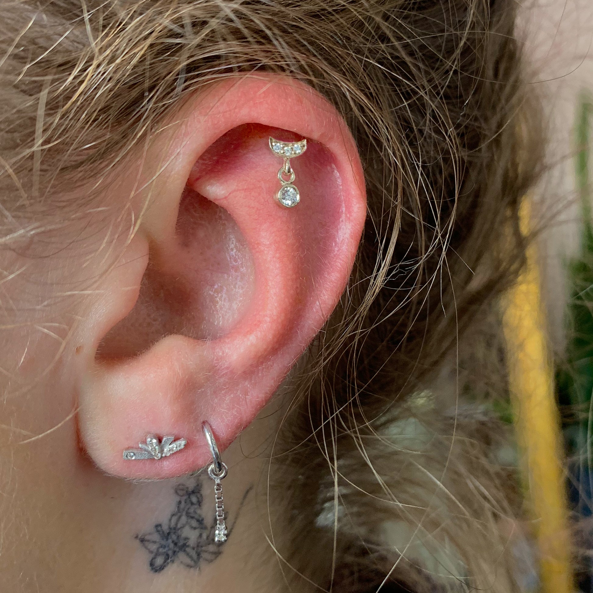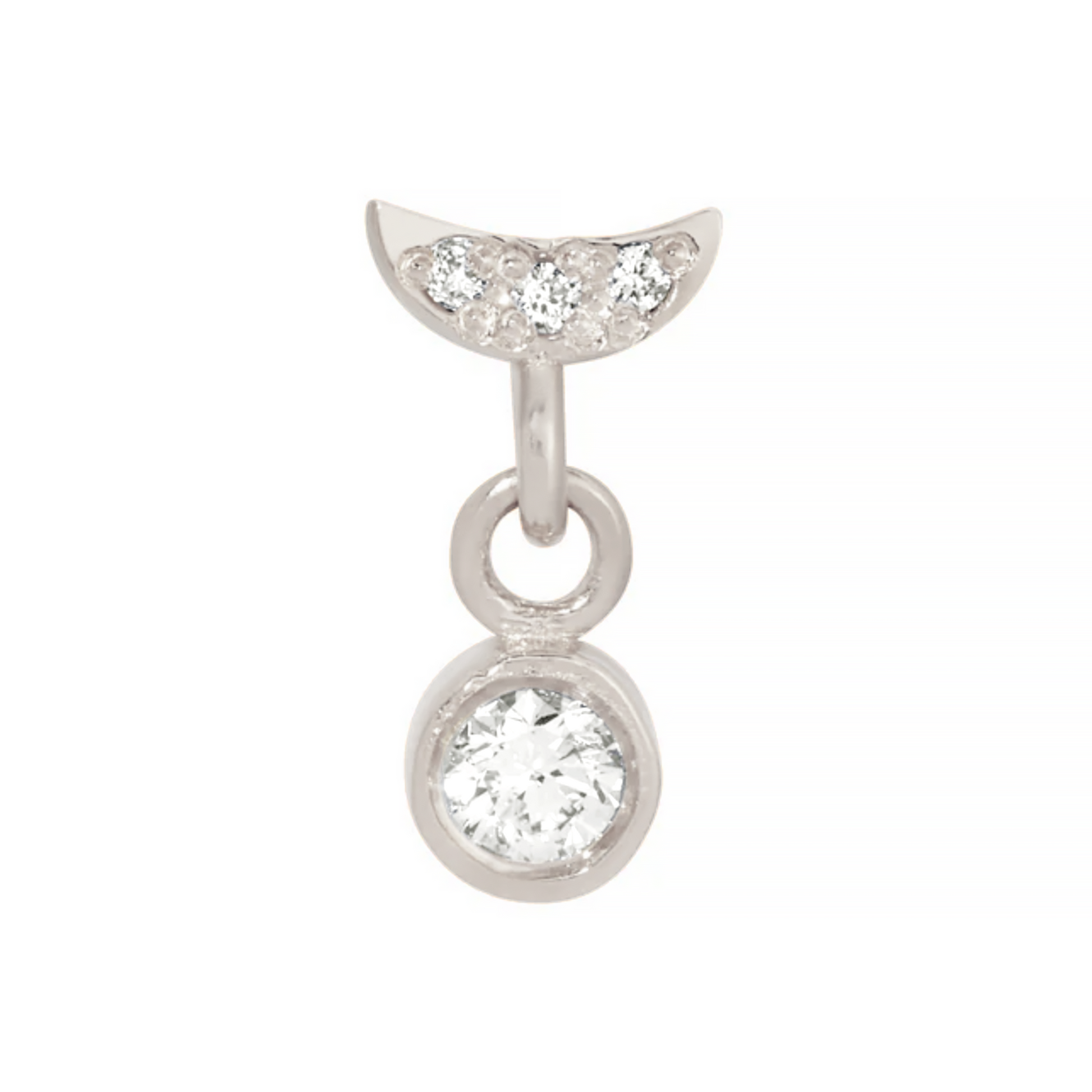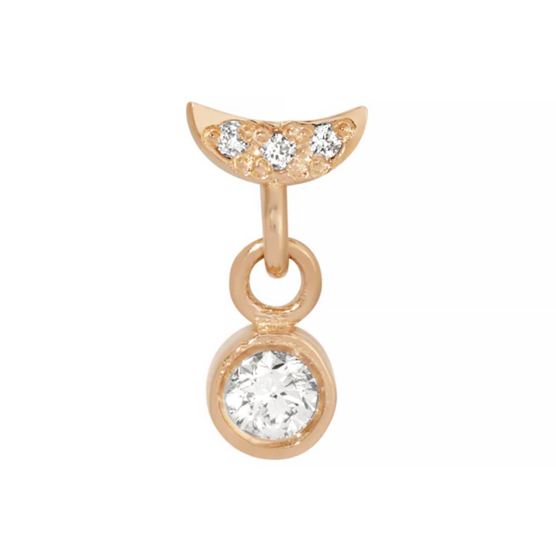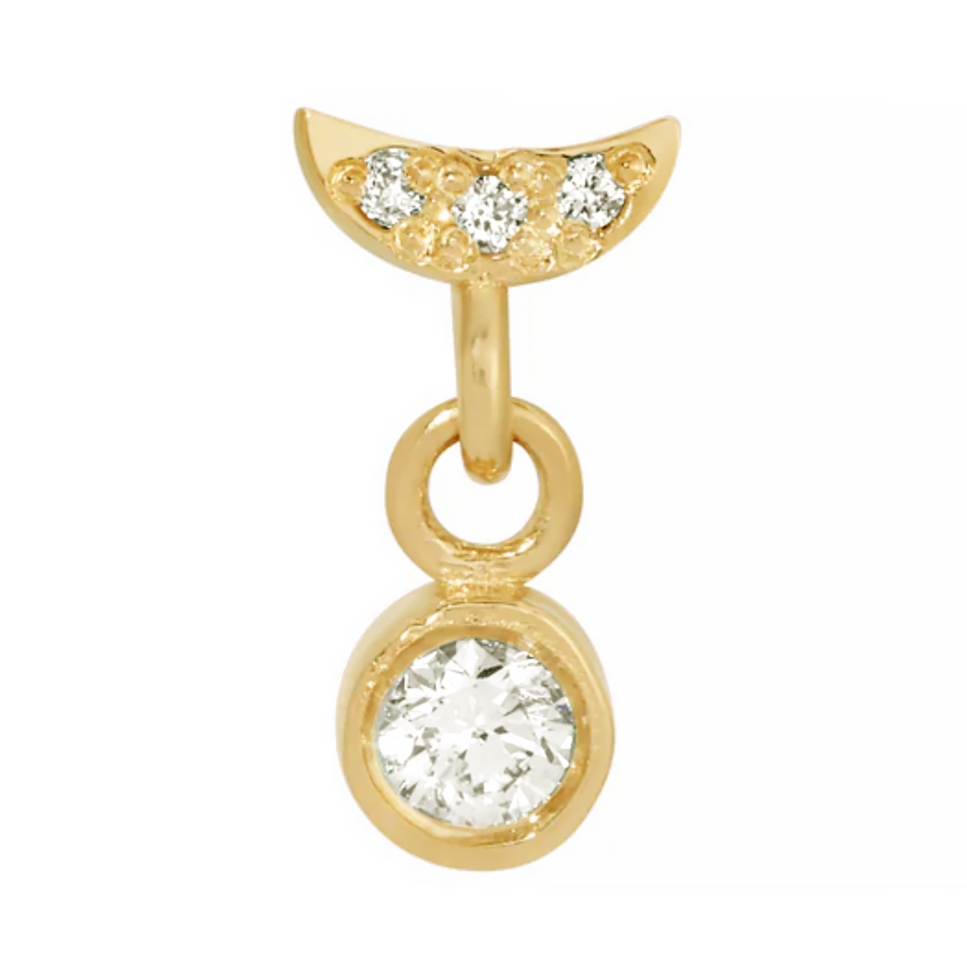 From our exclusive body jewelry collection with Jennie Kwon. This threadless end has a pavé diamond crescent at the top a 2mm bezel diamond dangle.