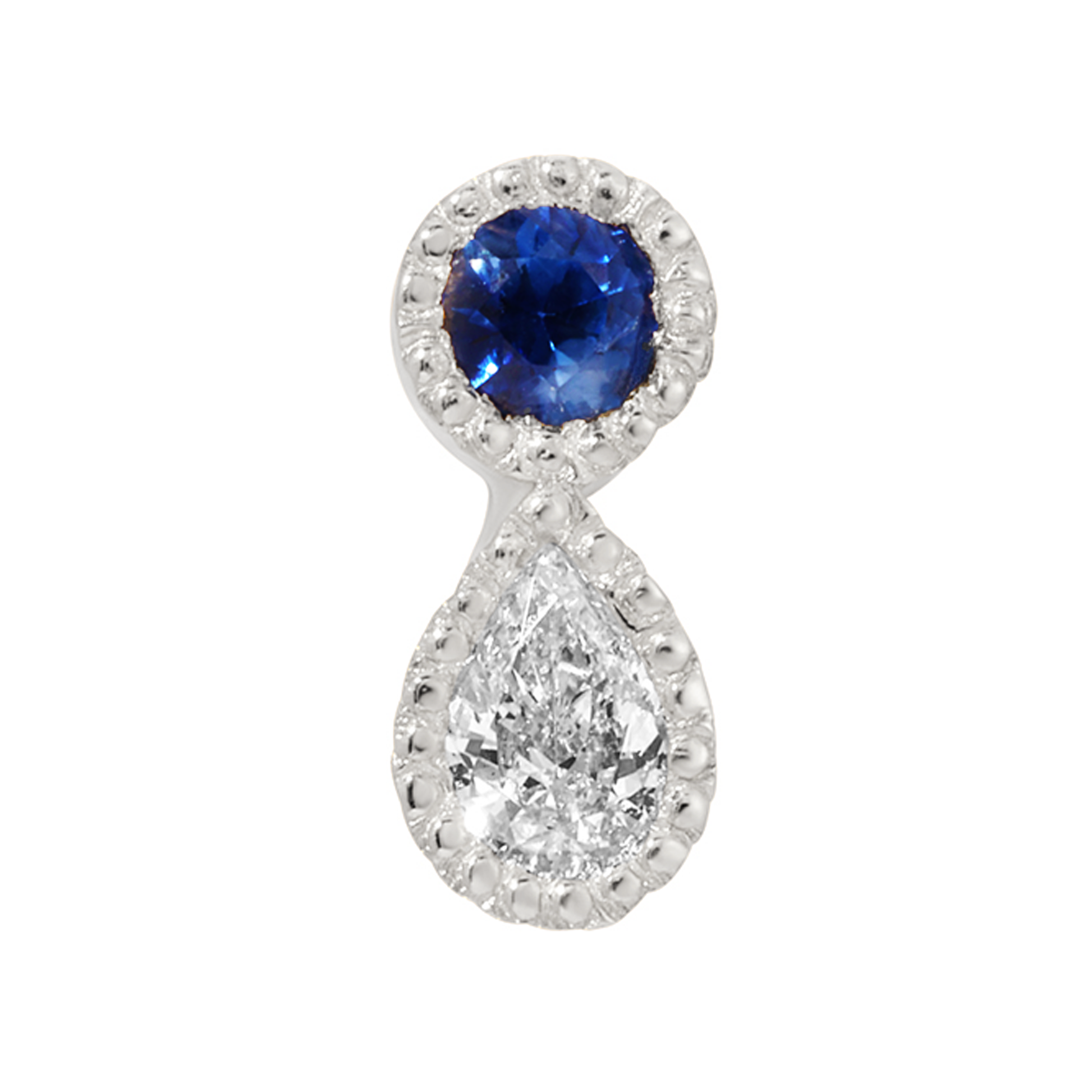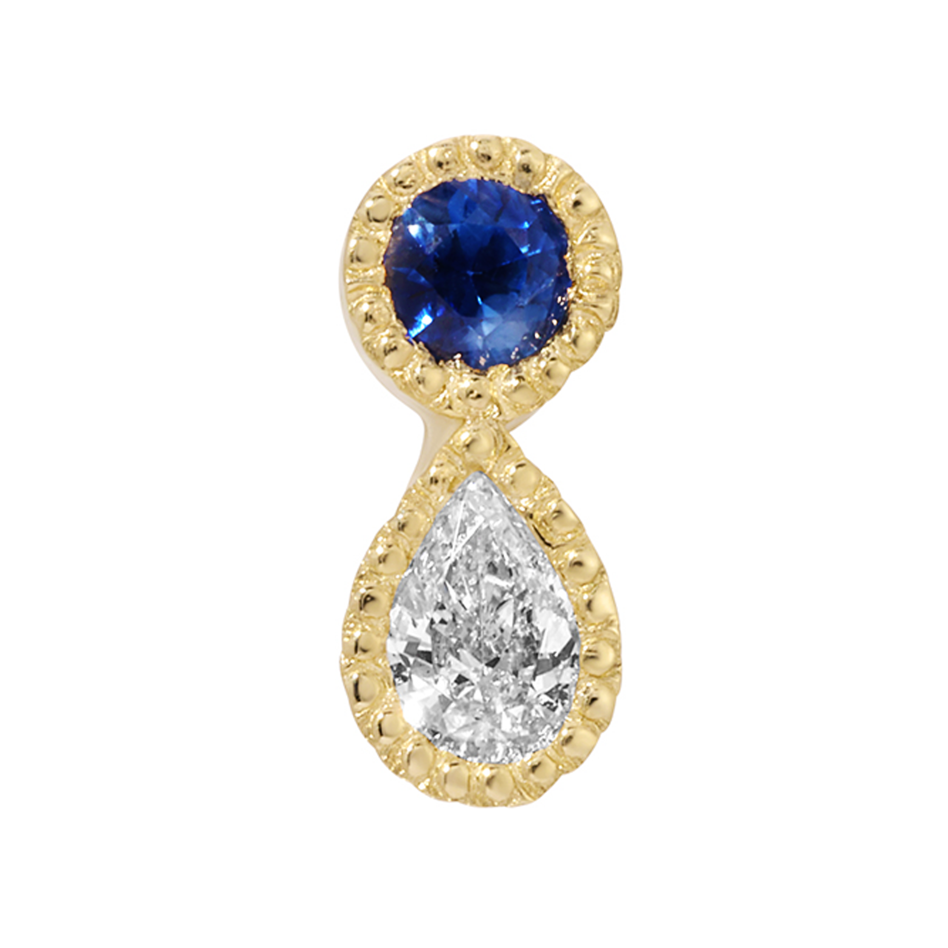 New in from our exclusive body jewelry collection with Jennie Kwon, this Dewdrop threaded end features a bold blue sapphire or emerald and a pear shaped diamond in milgrain bezel settings.