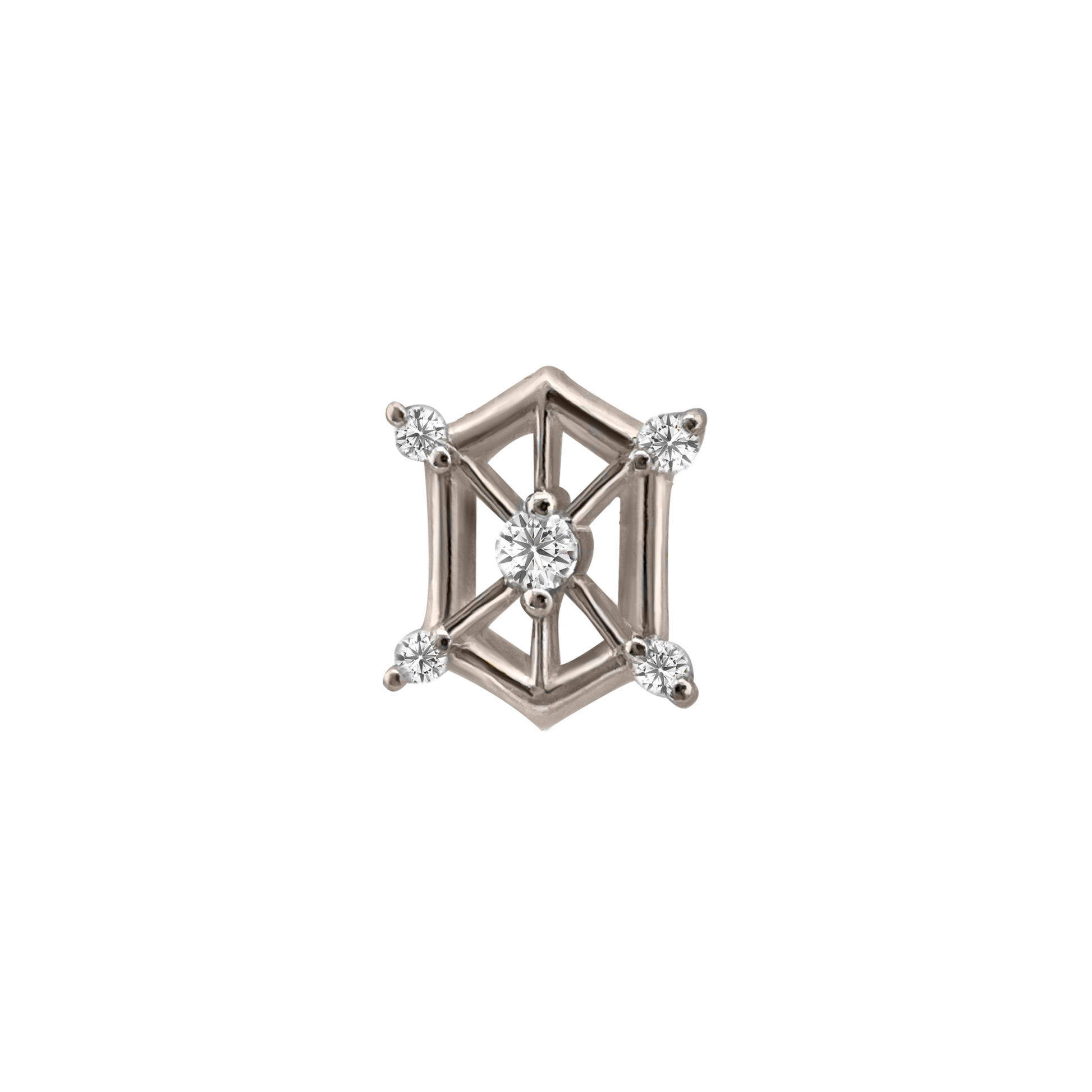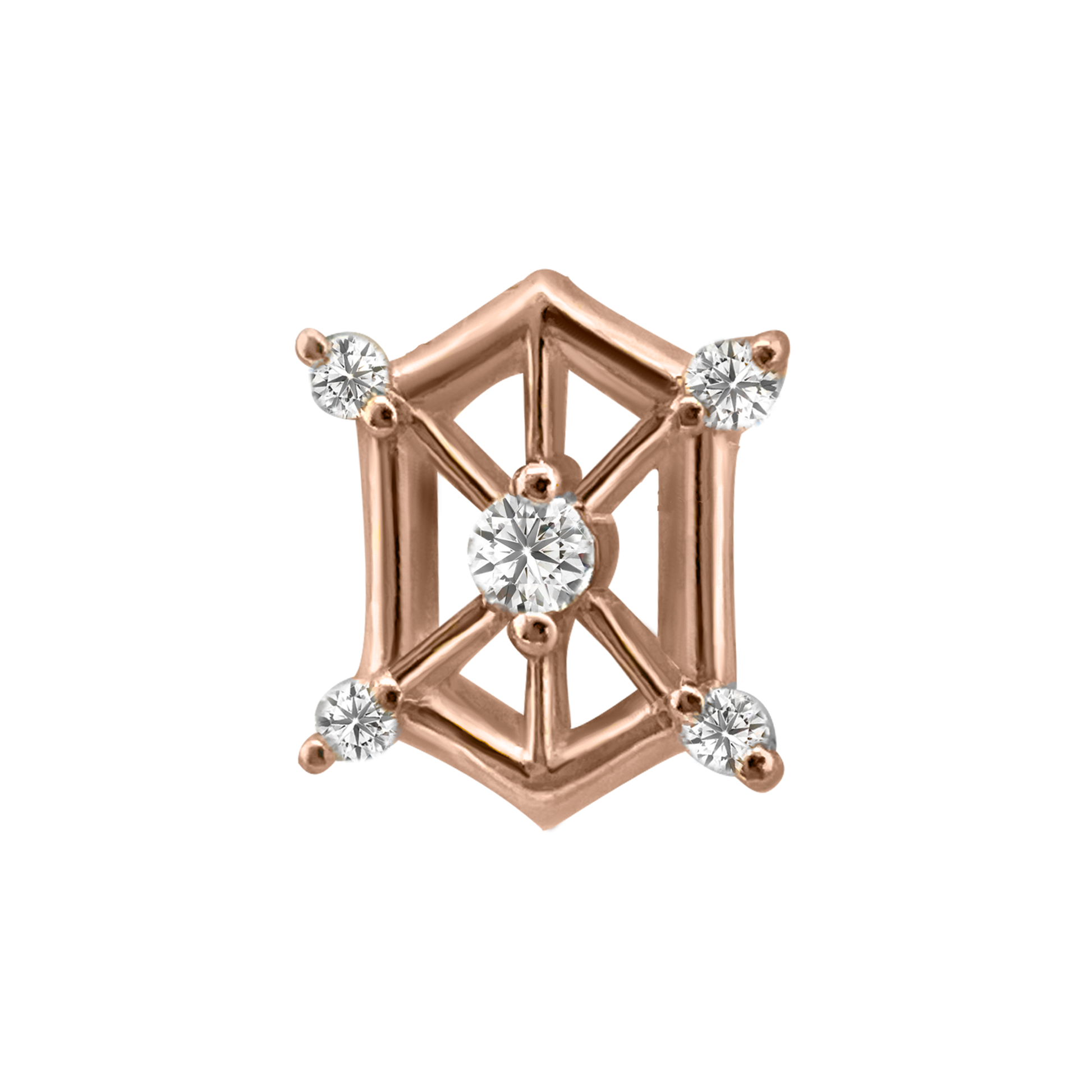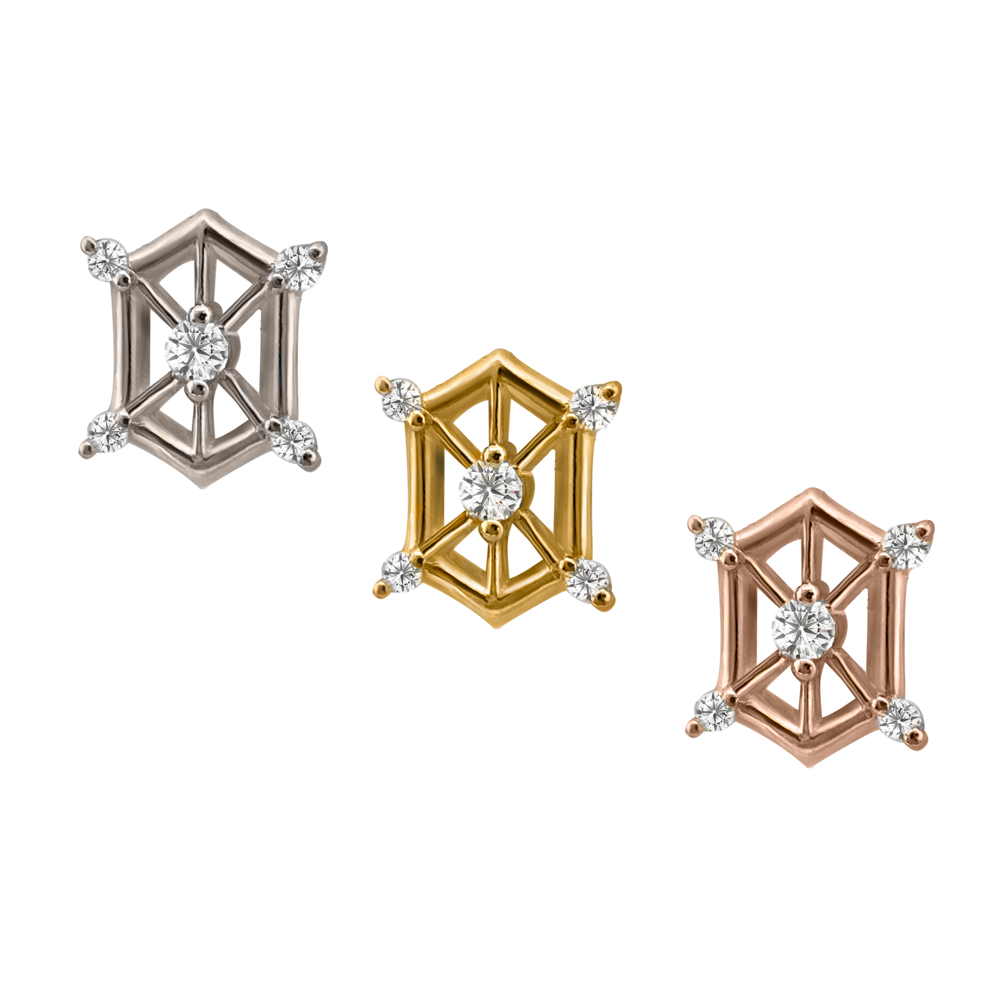 From our exclusive collection of body jewelry with Hiddenspace Los Angeles, the Line Hexagon End balances slightly matte gold with five brilliant diamonds. Reminiscent of a spider web, angular lines draw the eye to each white diamond and uses negative space to create an even pattern.