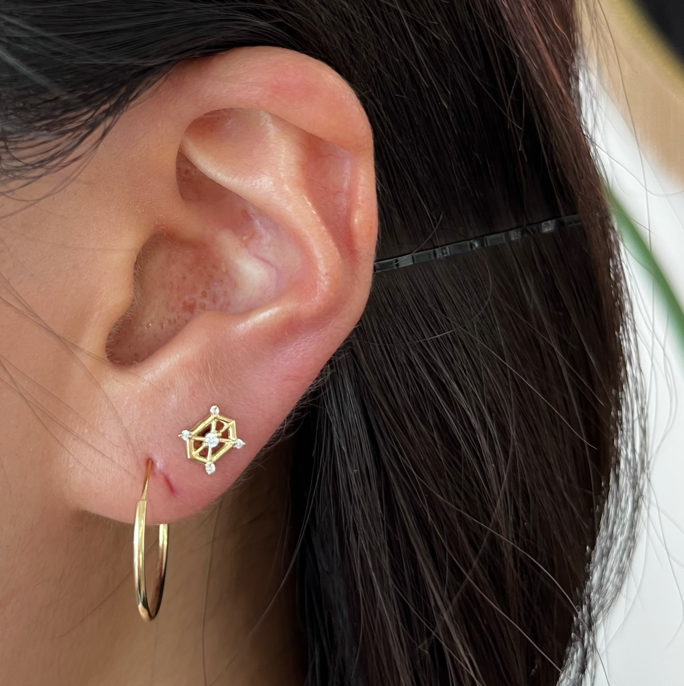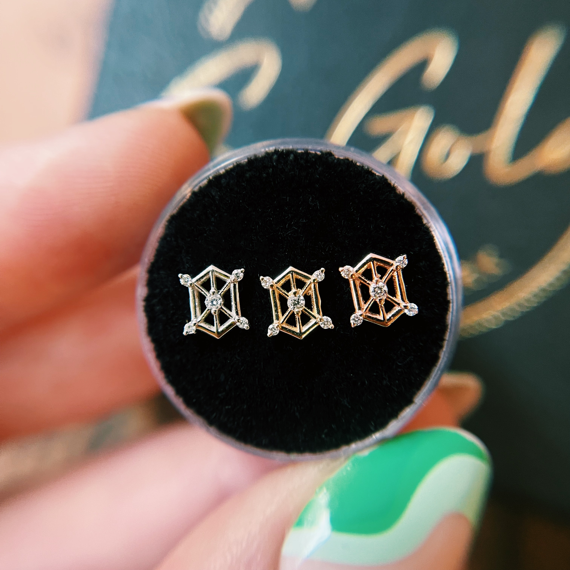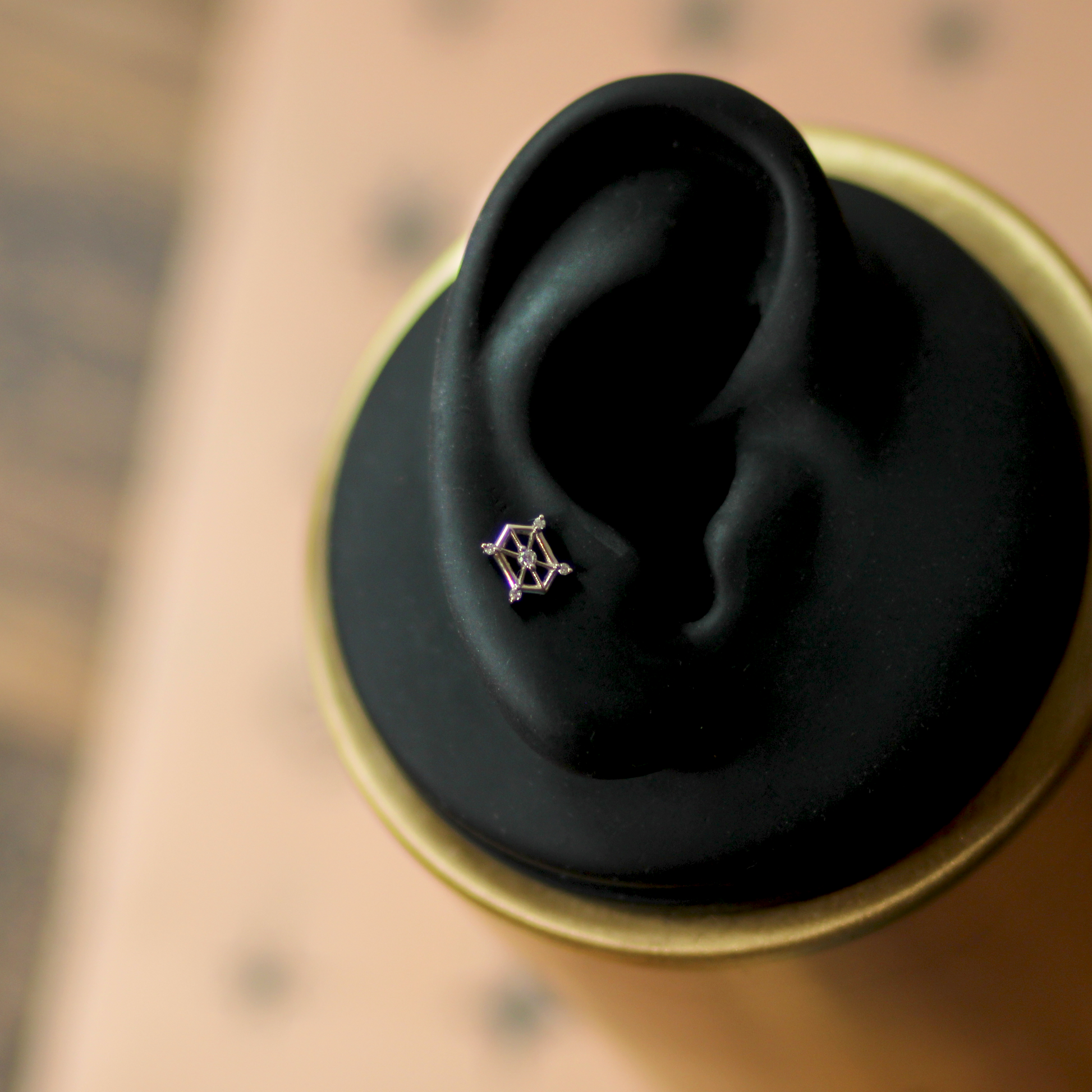 From our exclusive collection of body jewelry with Hiddenspace Los Angeles, the Line Hexagon End balances slightly matte gold with five brilliant diamonds. Reminiscent of a spider web, angular lines draw the eye to each white diamond and uses negative space to create an even pattern.