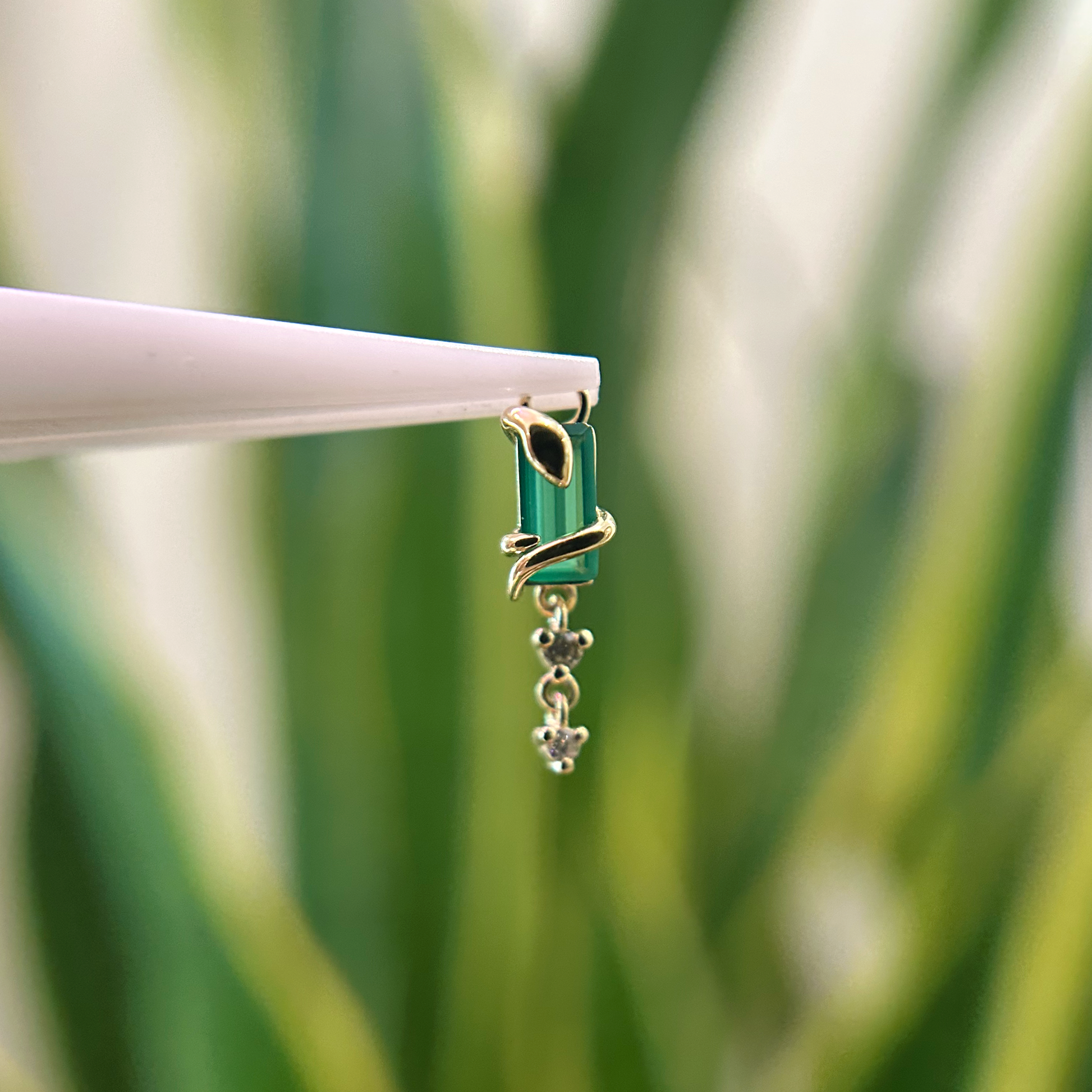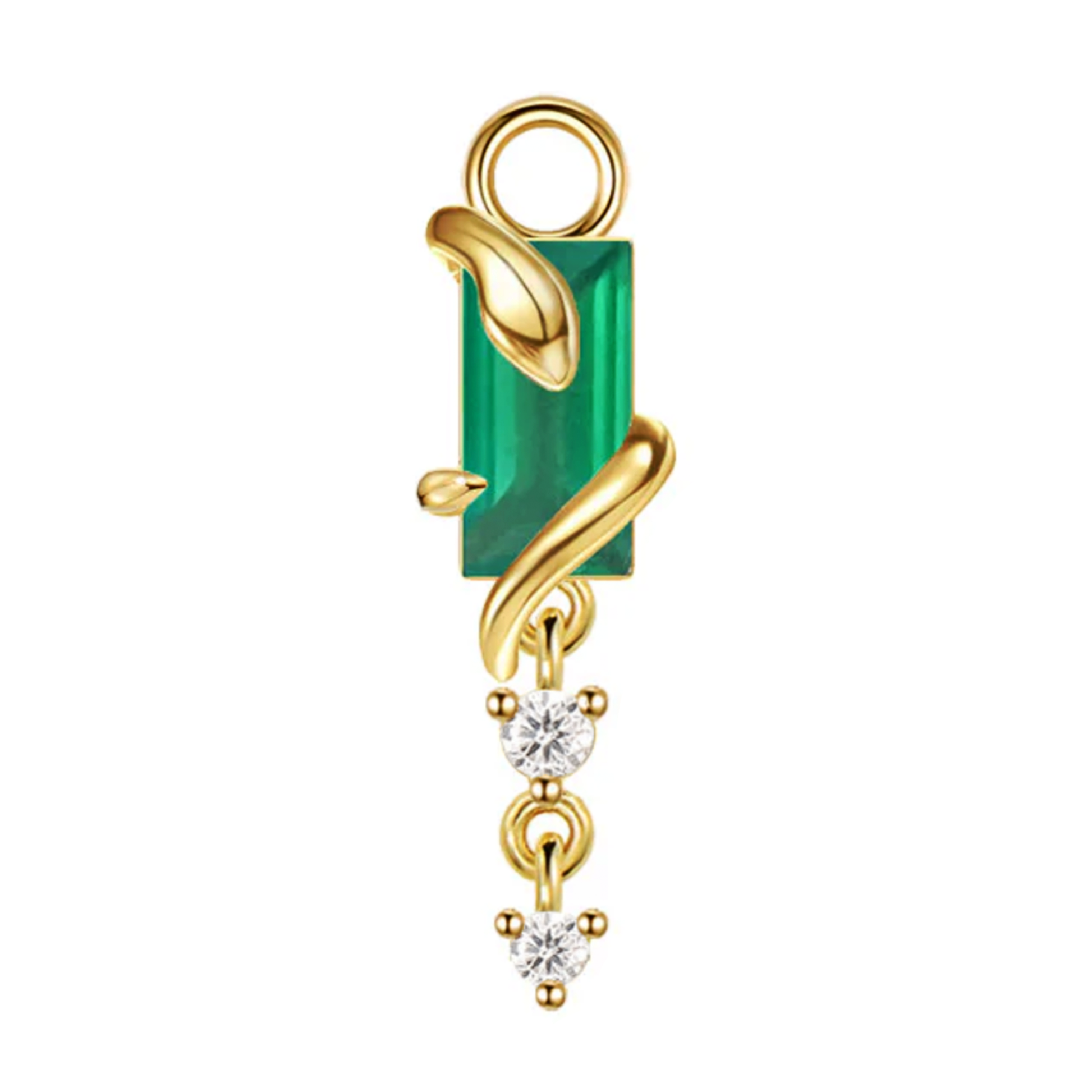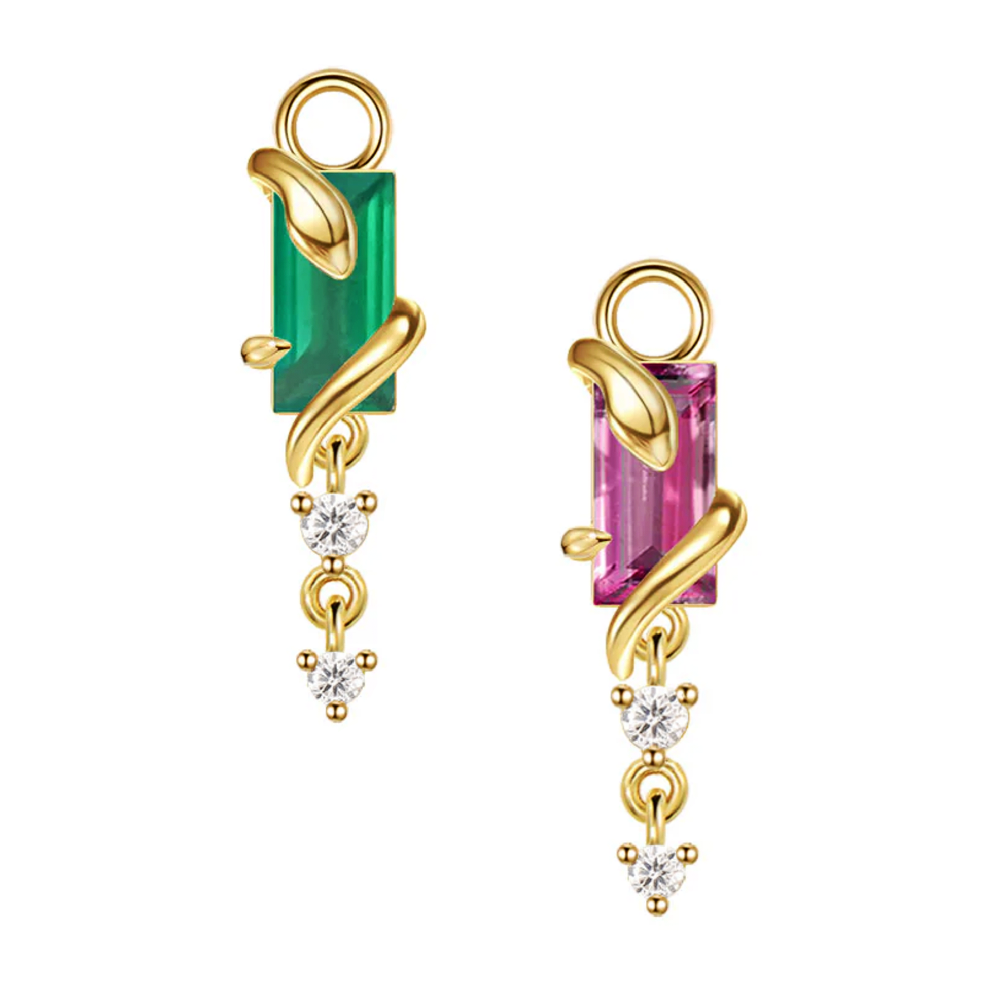 New in from Modern Mood! The Eden Snake dangle features and vibrant baguette gemstone wrapped in a gold snake, with a double diamond dangle.