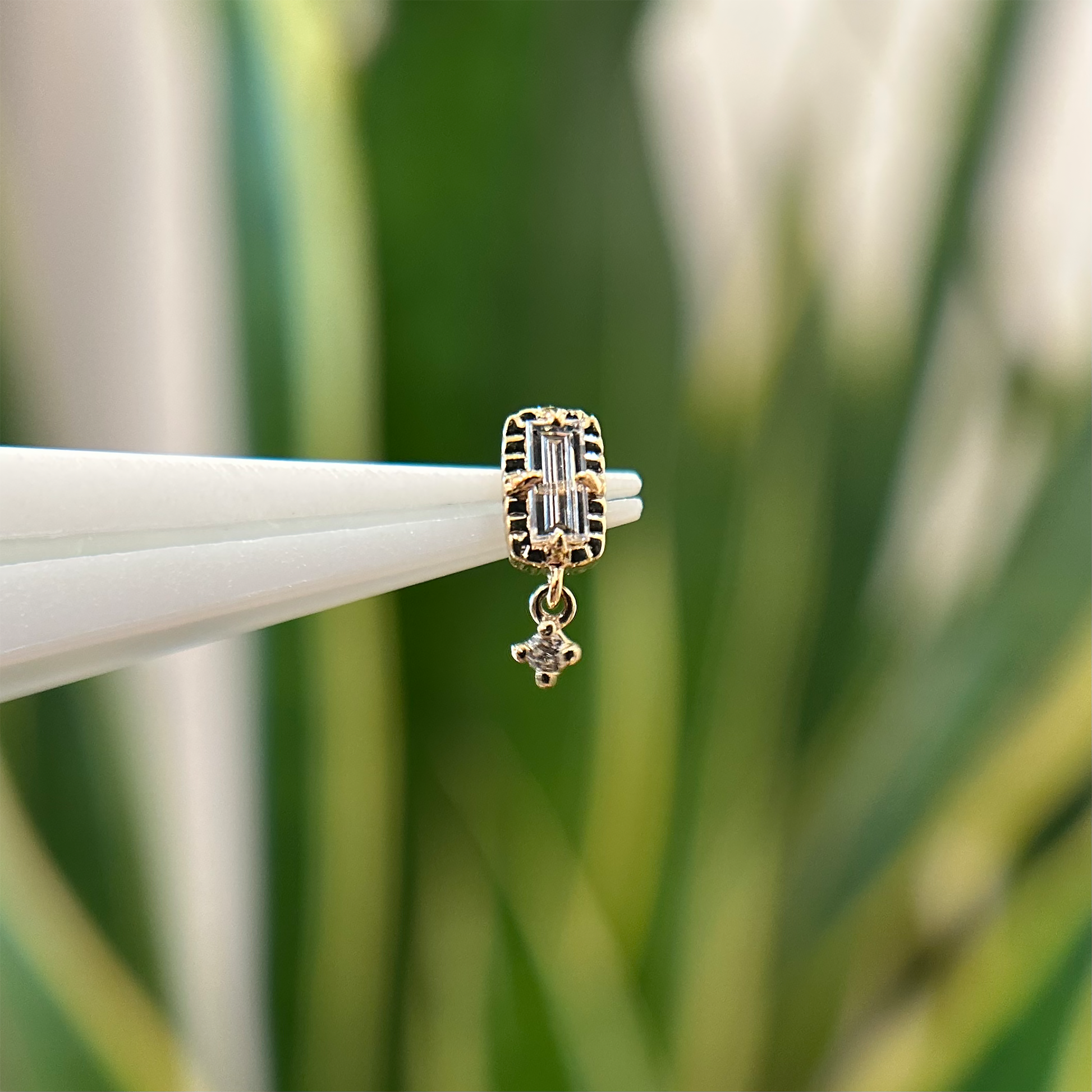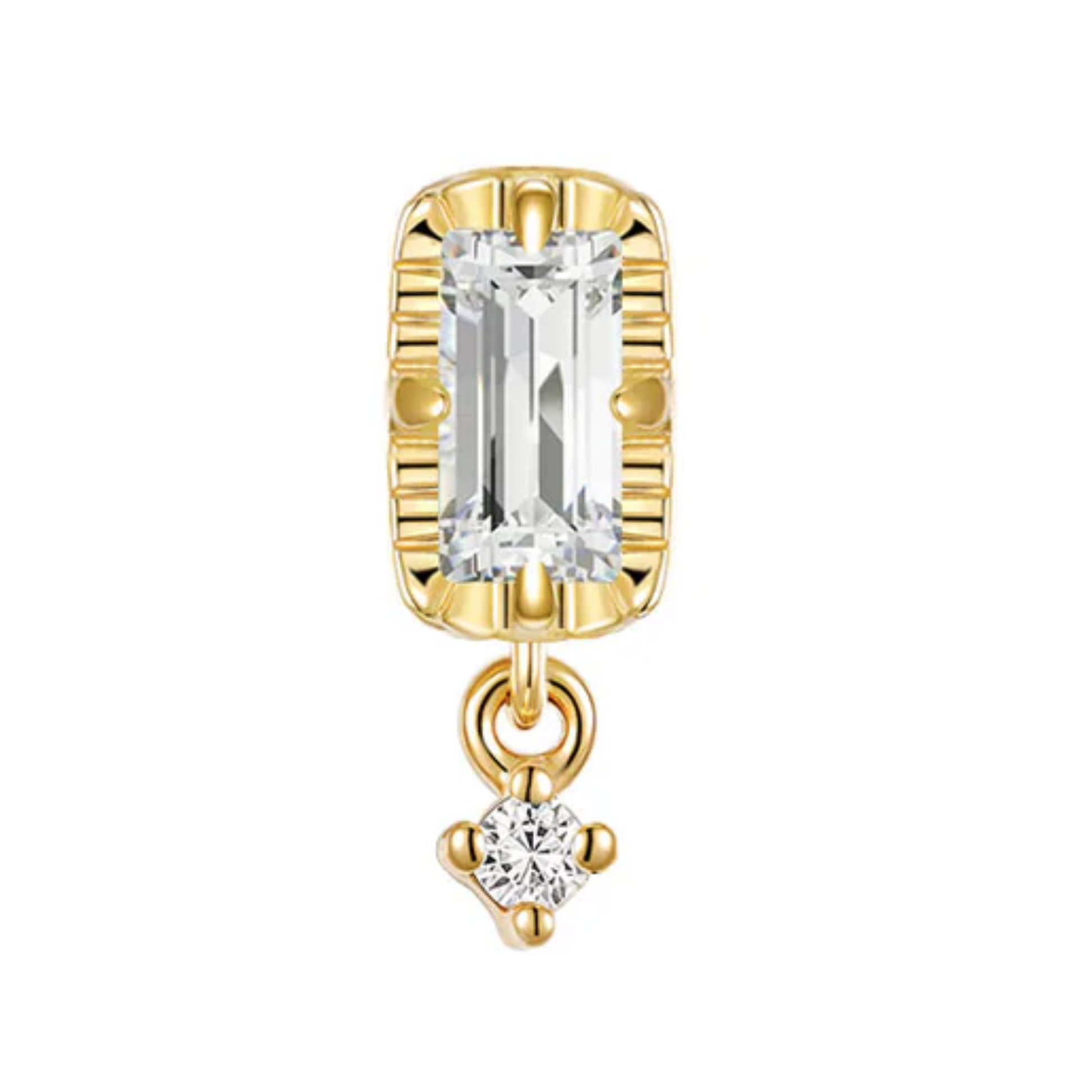 New in from Modern Mood, the Jessie threadless end features a baguette diamond in a fluted setting with a round diamond dangle.