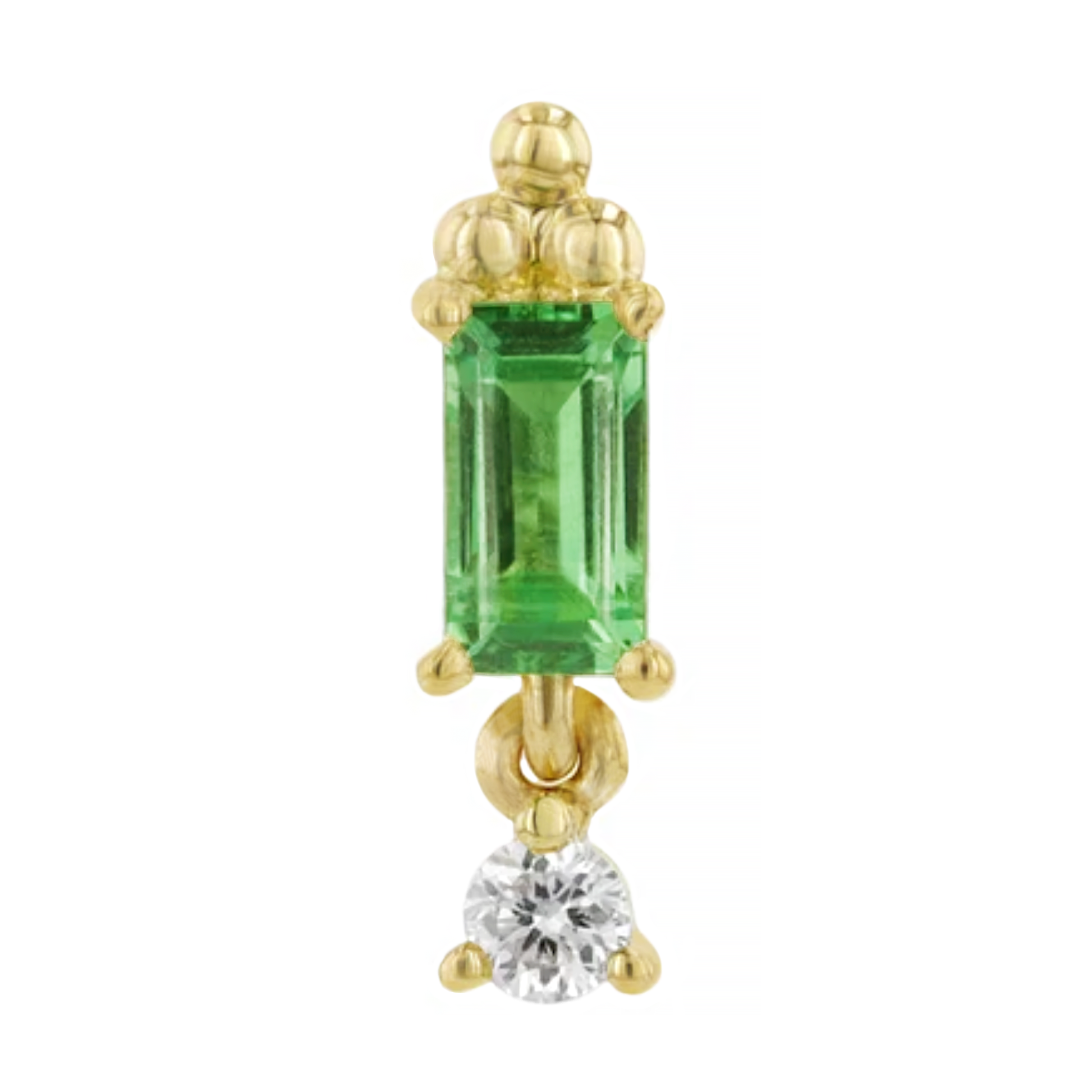 Part of Modern Mood's latest limited edition collection, this tsavorite bagette end is adorned with tri bead accents and a diamond dangle.