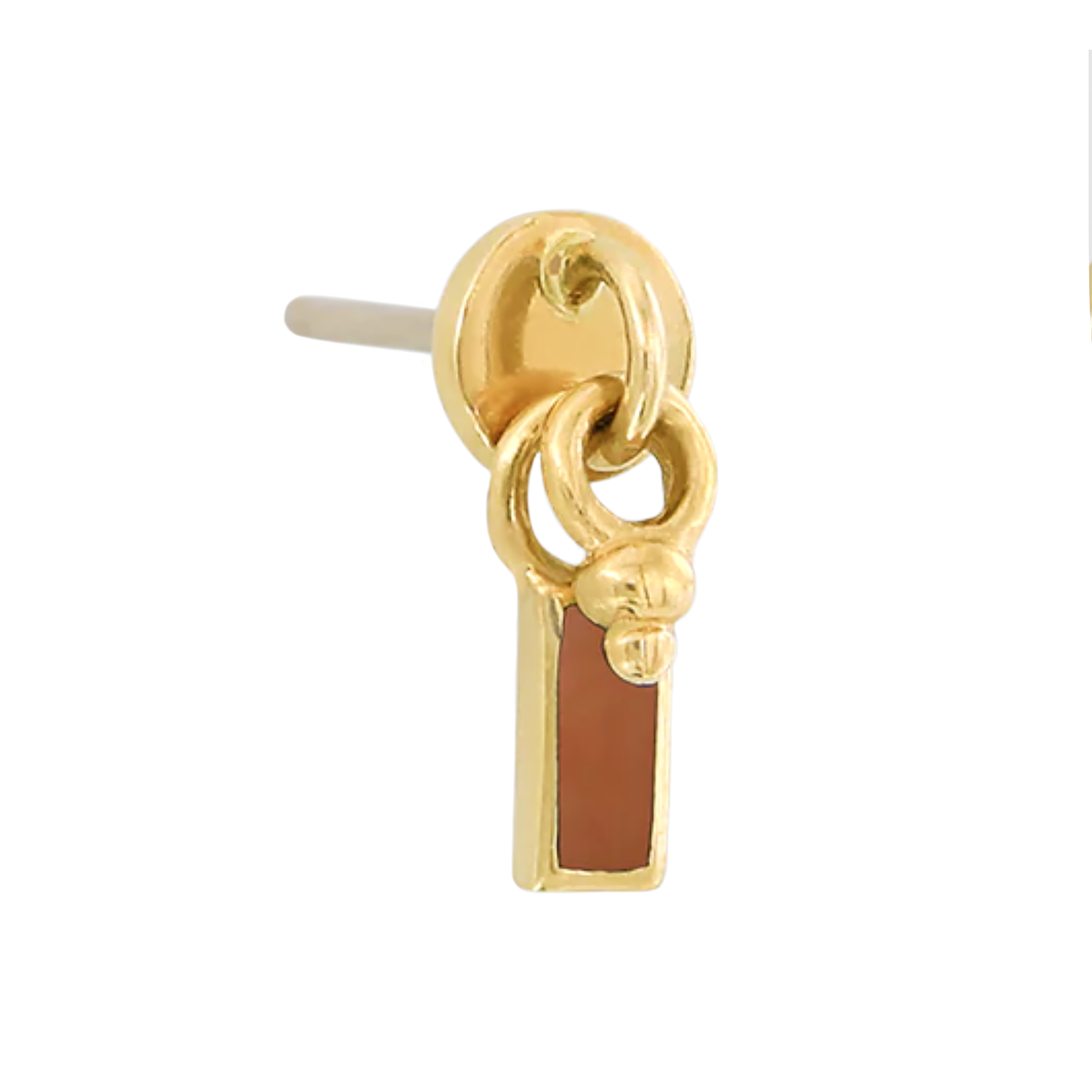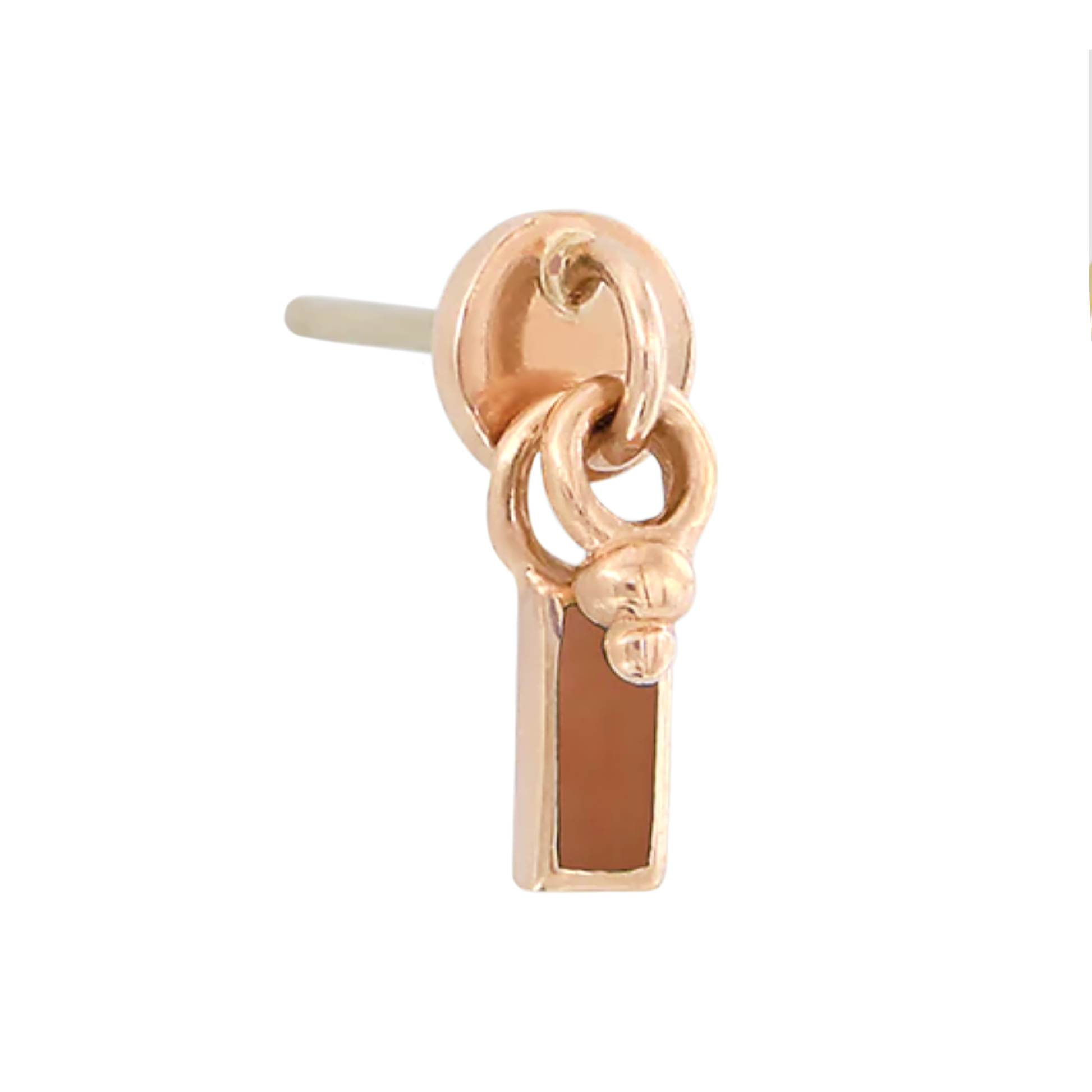 New in from Pupil Hall, this threadless end features a round base with a rectangular brown enamel charm and bead dangles.