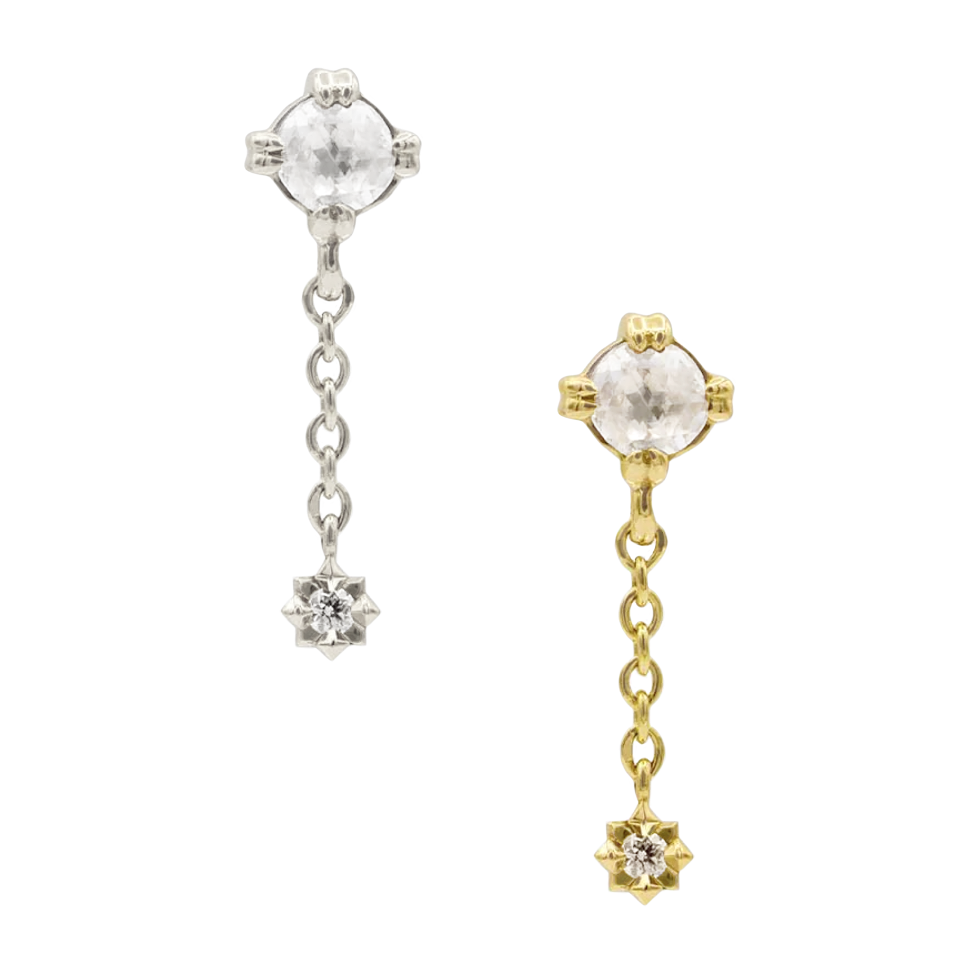 From Tether, the Divine threadless end showcases a 2.5mm rose-cut diamond top with a 1mm star-set diamond at the bottom of a chain drop.