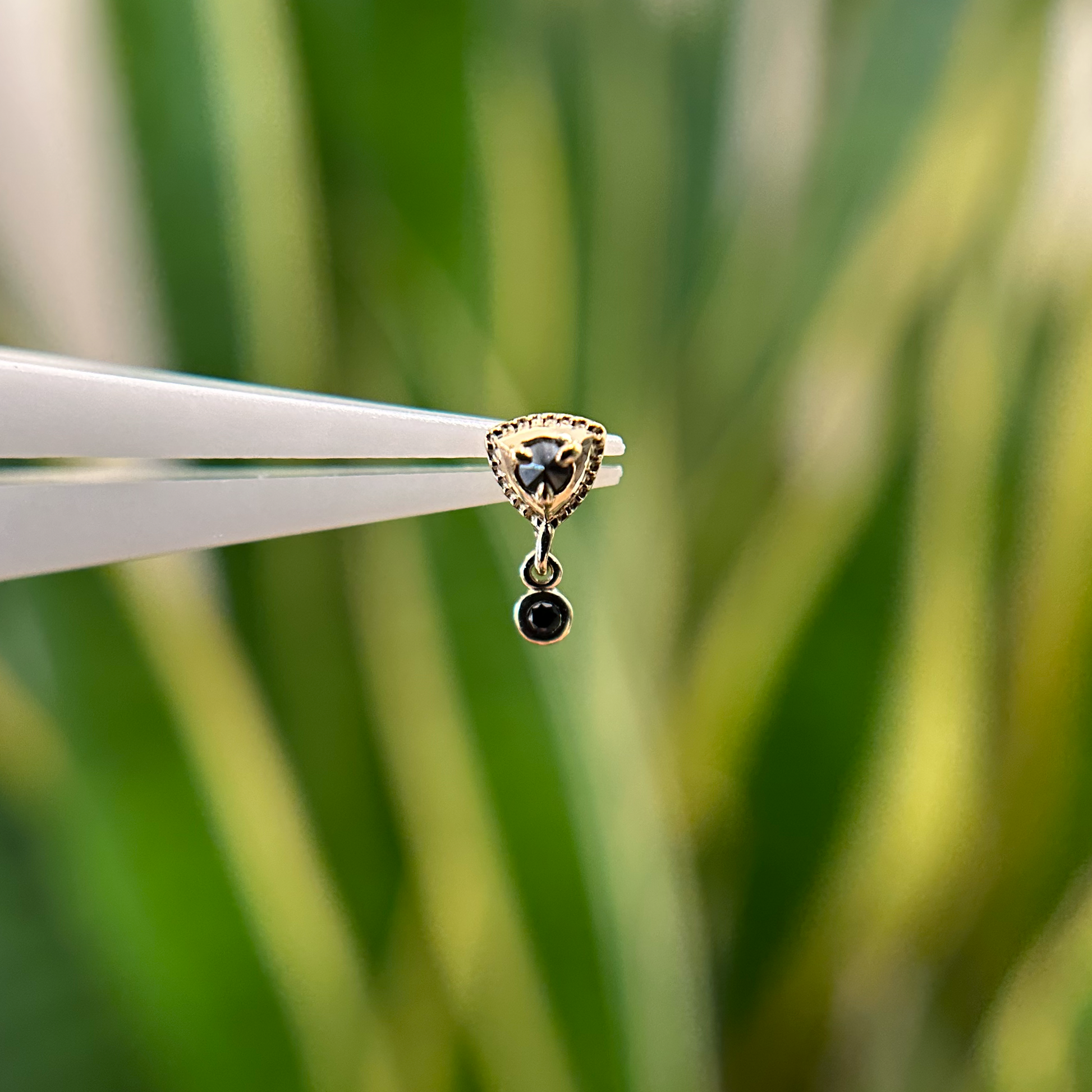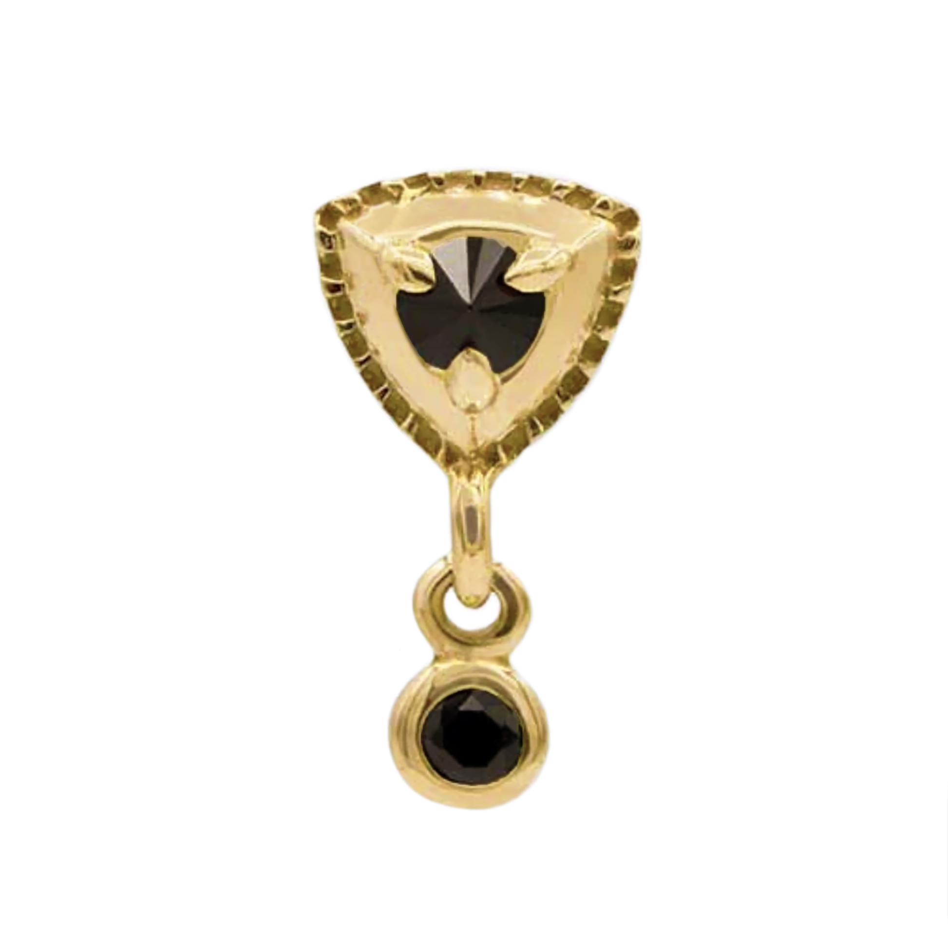 Inspired by ancient shields, this threadless end from Tether features a reverse-set black diamond on top with a bezel-set black diamond dangle.